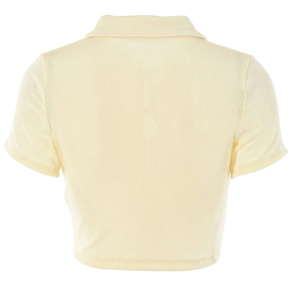 The crop button-down brings a retro vibe to your street look. Made of lightweight polyester fabric, embellished with a cropped length accented with a curved hem, featuring a slim fit cut along with a point collar, a button placket to the front and a short sleeve styling. Find more unique women’s crop tops or trendy clothing in our boutique, and style along with a brown baguette bag and a floral miniskirt.