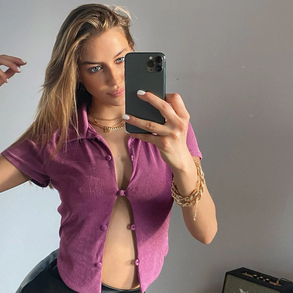 The crop button-down brings a retro vibe to your street look. Made of lightweight polyester fabric, embellished with a cropped length accented with a curved hem, featuring a slim fit cut along with a point collar, a button placket to the front and a short sleeve styling. Find more unique women’s crop tops or trendy clothing in our boutique, and style along with a brown baguette bag and a floral miniskirt.