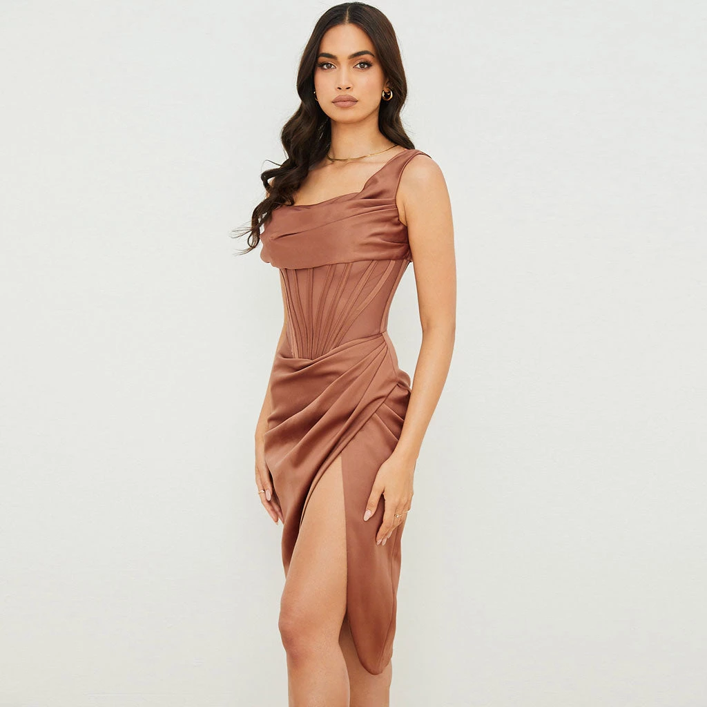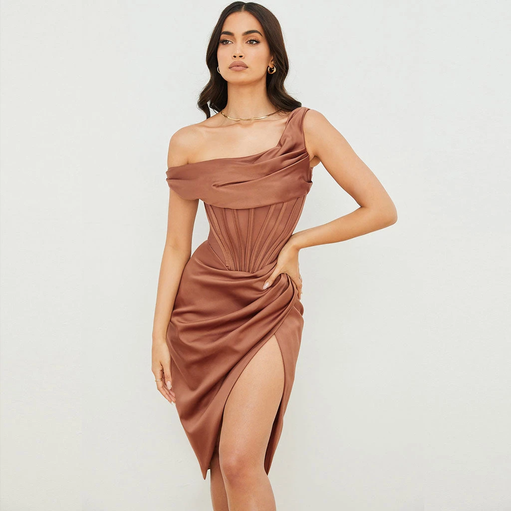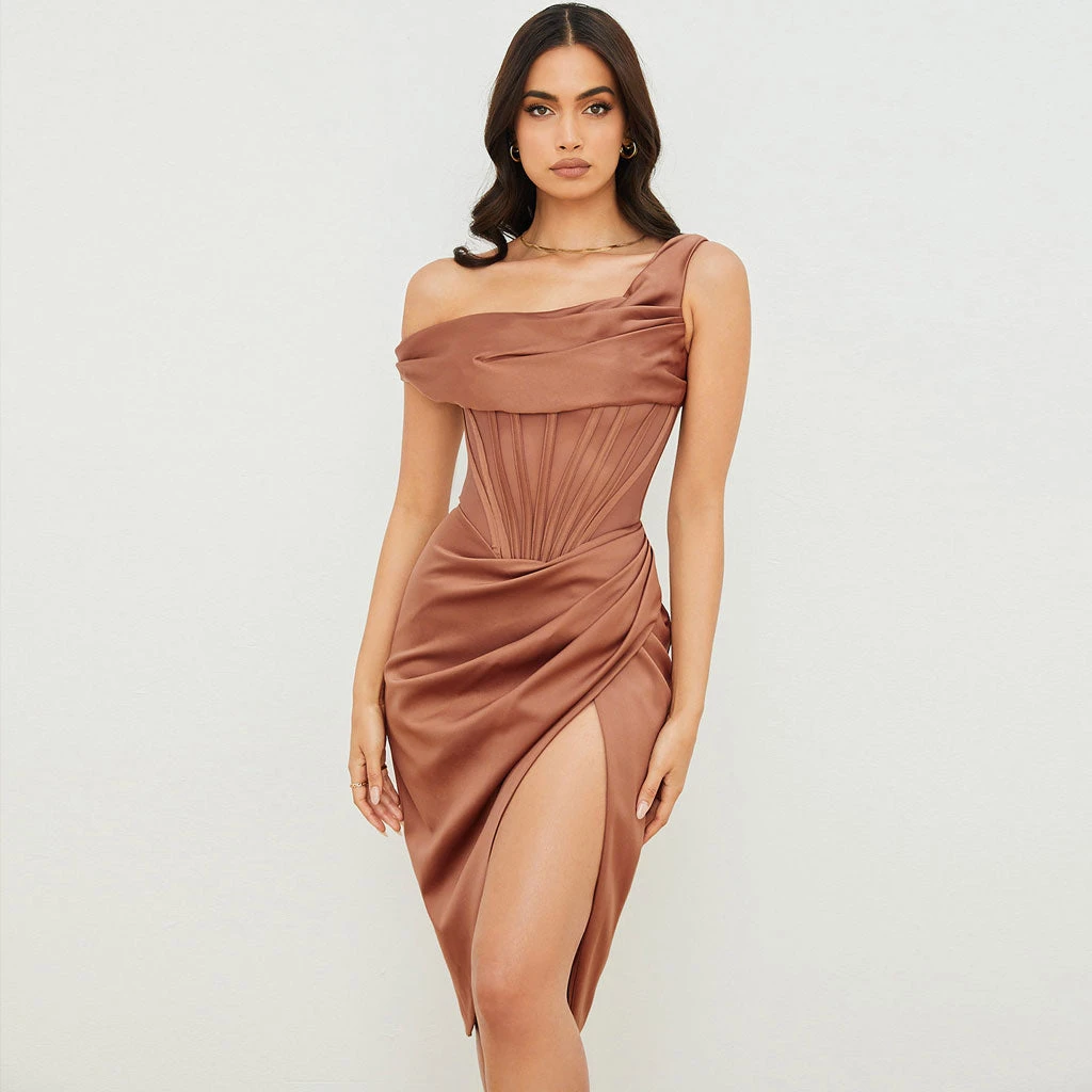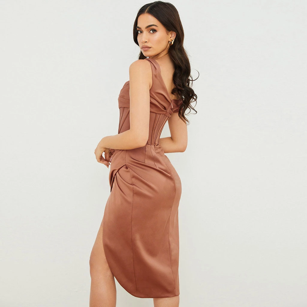 Trendy & Unique Sexy Cowl Neck One Shoulder Corset Satin Cocktail Midi Dress – Khaki What’s New