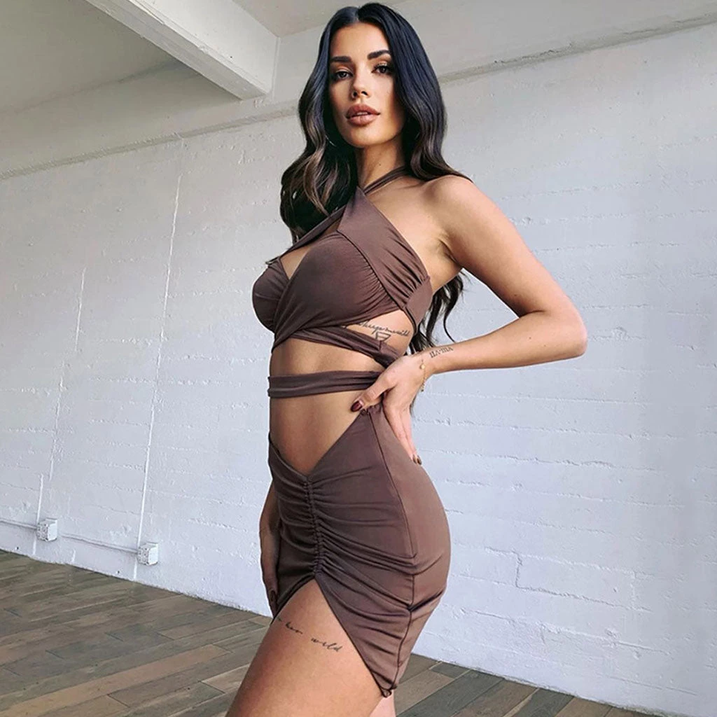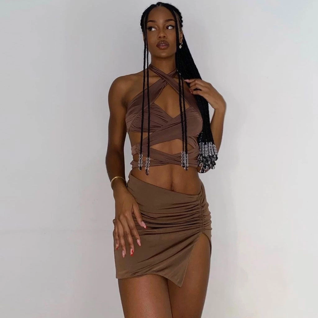 This sharp skirt set is indeed a perfect club-ready outfit. Made of stretchy polyester in solid color, embellished with a bandage styling, featuring a crossover halter top accented with wraparound straps fastening to the rear, and complete an alluring two piece set with a high rise skirt accented with a midriff cut at the waist and a drawstring tie at front. Find more trendy women’s matching sets or unique clothing in our boutique, and finish a sexy going out look with killer heels.