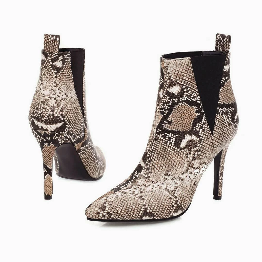 This pair of ankle boots adds a wide touch for your cold-weather look. Crafted with PU leather and rubber, stand out in snakeskin embossing all-over, featuring an ankle-height topline, a slip-on styling with elastic insert on sides, slightly fleece lining, sharp pointed toes to the front, and stiletto heel sole along with rubber heel cap. Find more trendy women’s boots and unique shoes in our boutique, and wear the stylish boots with anything from skirts to slim trousers for a confident street look – Heel height: 10 cm.