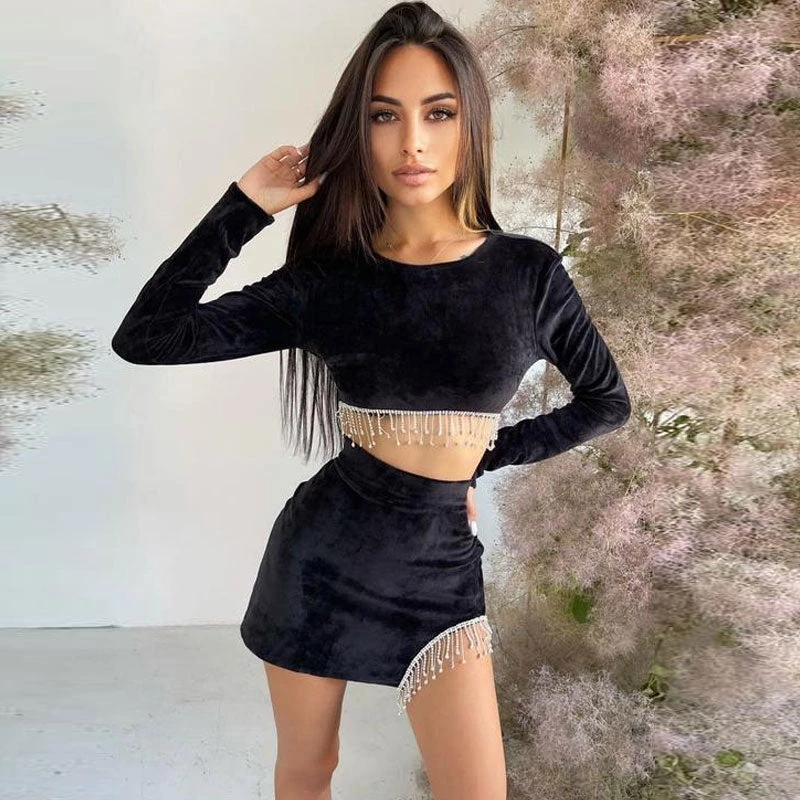 Dance the night away in style in this sparkly skirt set. Crafted with thin velvet and polyester, stand out in shimmering diamante-trimmed tassels, featuring a crop top along with long sleeves, a sexy cutout with a button closure to the rear, and complete a dazzling two piece set with a stylish high rise miniskirt accented with an asymmetrical cut at short hem. Find more trendy women’s party-ready matching sets or unique clothing in our boutique, and pair it with dangle earrings and a dazzling pair of butterfly heels for a stunning look at night.
