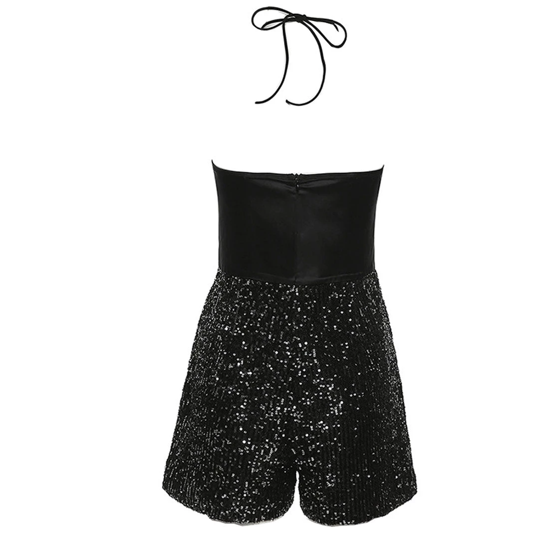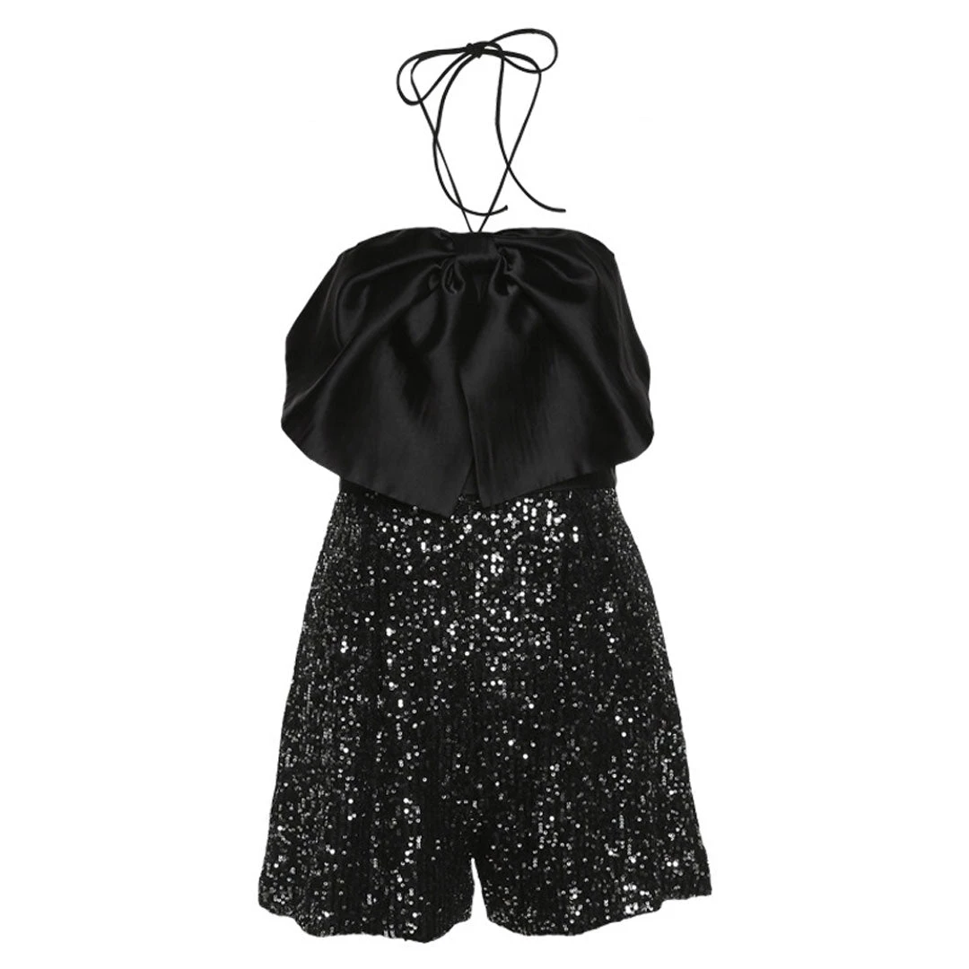 This glittering sequin romper is a picture-perfect piece that you’ll love for party nights. Crafted with silky satin and polyester fabric, stand out in a cute, oversized bow applique at the chest, featuring a bandeau top with a halter tie around the neck, a concealed rear zip closure, and a thigh length bottom accented with glistening sequined details in a wide-leg hem. Find more trendy women’s statement rompers or unique clothing in our boutique, and easily styled from the party to the street all depending on shoes and accessories.
