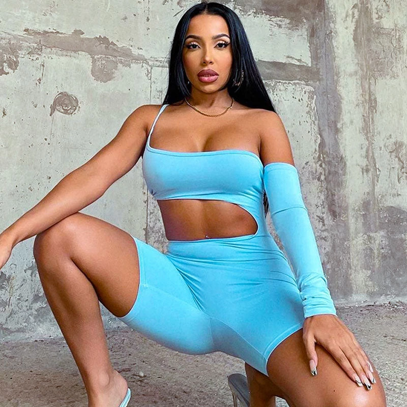 This stylish romper is a sexy one-and-done pick from day to night. Made from stretchy polyester fabric, stand out in a dramatic cut-out at the waist, featuring a single-shoulder neckline along with a slender shoulder strap, a slim fit accented with a single long sleeve styling, and a thigh length bottom with seamed hems. Find more trendy women’s rompers or unique clothing in our boutique, and finish a street look from casual sneakers to heeled sandals.