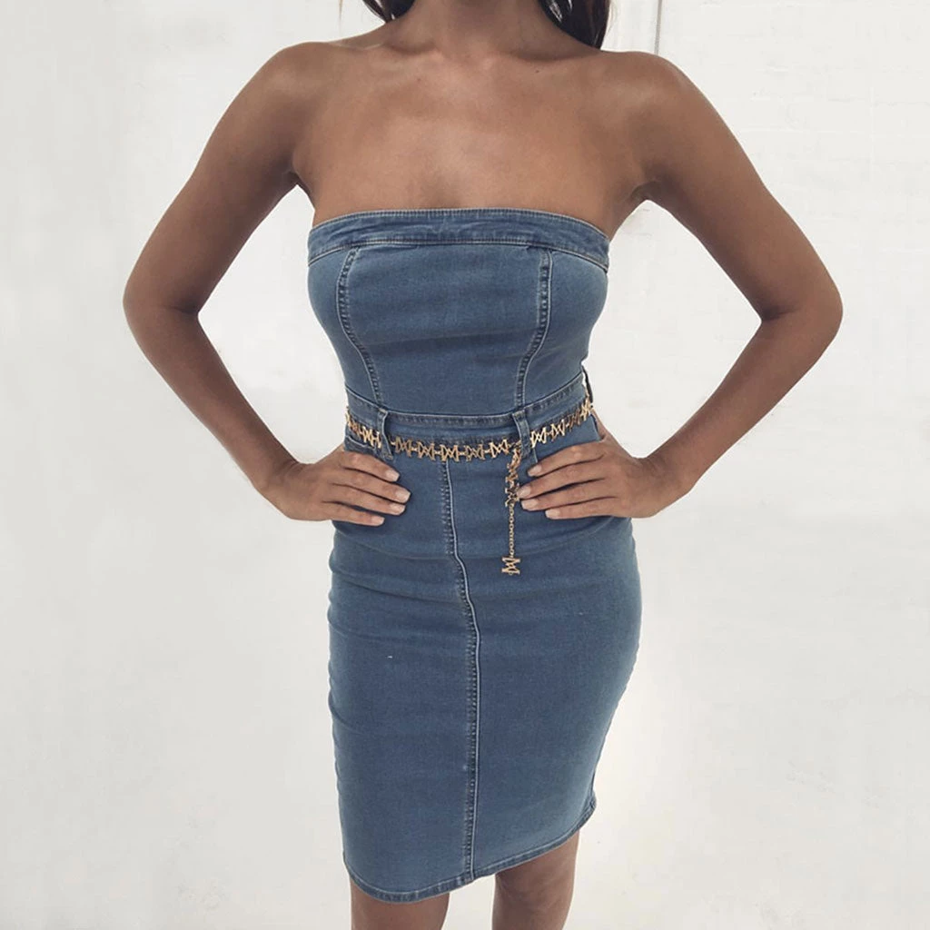 This strapless denim dress brings a nostalgic vibe to your modern look. Crafted with blend denim fabric and polyester, embellished with a classic five pockets styling, featuring a slim fit cut structured with belt hoops at the waist, a zip fastening to the rear and a mini length accented with a back slit. Find more unique women’s denim dresses or trendy clothing in our boutique, and wear it solo, or layer it with everything-depending on the look you want.