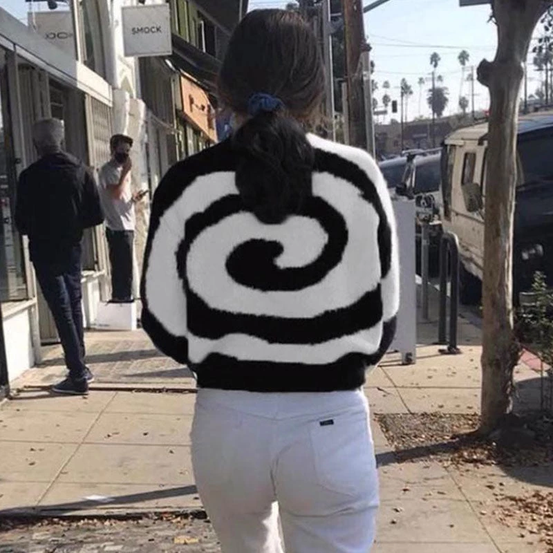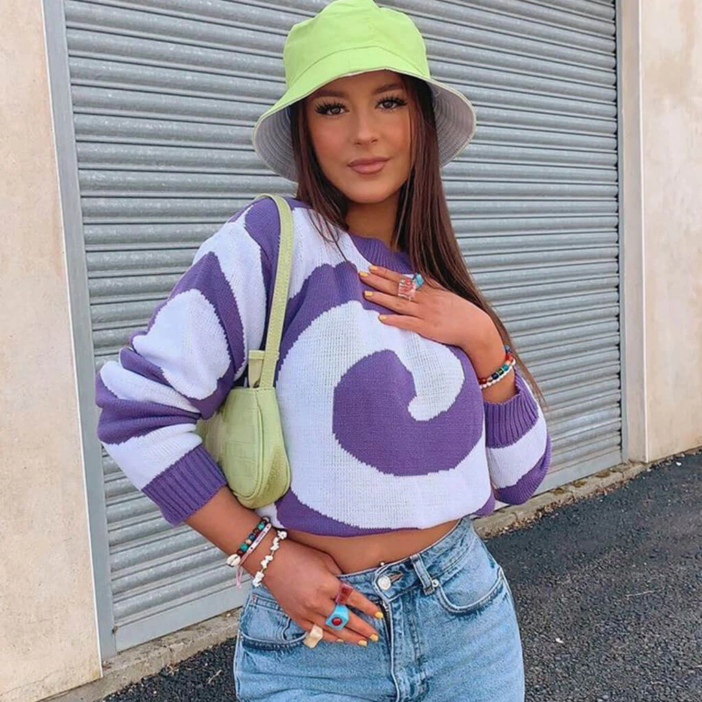 The eye-catching knit top is perfect pick for street style. Crafted with blend acrylic and polyester, embellished with a huge whirlpool pattern allover, featuring a stylish fit with special print knit structured with a ribbed crew neckline, long blouson sleeves and ribbed cuffs, and a regular length accented with a ribbed hem. Find more trendy women’s sweaters or unique clothing in our boutique, and equally chic for lounge or work.