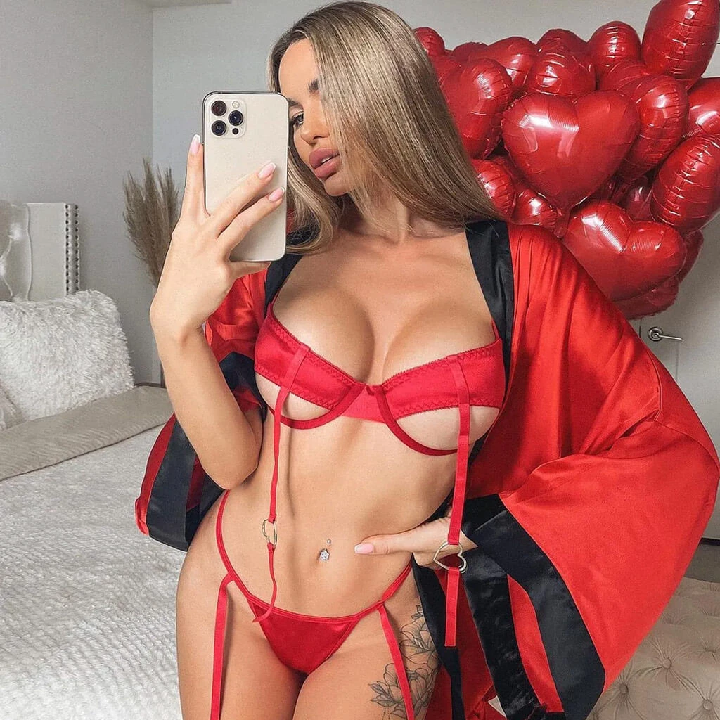 This silky satin bra set is another hit from our lingerie collection. Made from stretchy satin and nylon, stand out in satin straps with heart hardware, featuring unpadded underwire cups tailored with cut-outs, slender adjustable shoulder straps along with adjustable hook & eye closure to the rear, complete a sultry lingerie outfit with a pair of G-string. Find more unique women’s bra sets or trendy clothing in our boutique for a fashion-girl favorite.