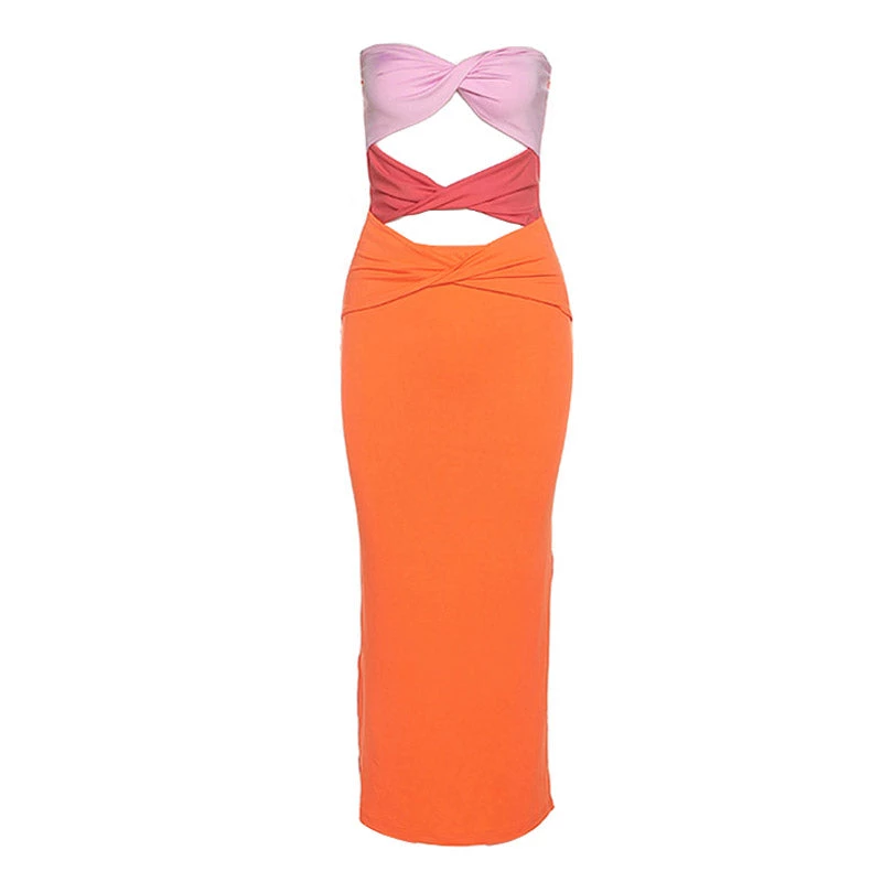This simple ’90s cutout dress is the stunner you want to wear over & over all summer long, and it will take you seamlessly from the street to the beach. Made of soft polyester, stand out in vibrant color paneled colourway, featuring a bandeau neckline accented with sexy cut-outs and twist details to the front, and a figure hugging cut with a side slit in a midi length. Find more trendy women’s vacation dresses or unique clothing in our boutique, and easily styled for day or night depending on the accessories you choose.