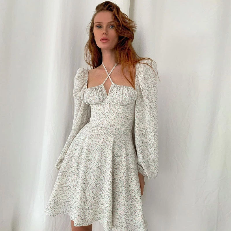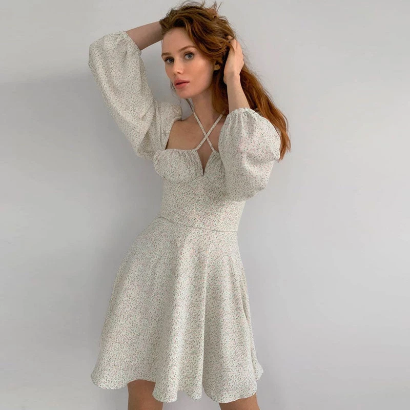 Trendy & Unique Sweet Puff Sleeve Tied Bustier Printed Skater Mini Dress – Green What’s New