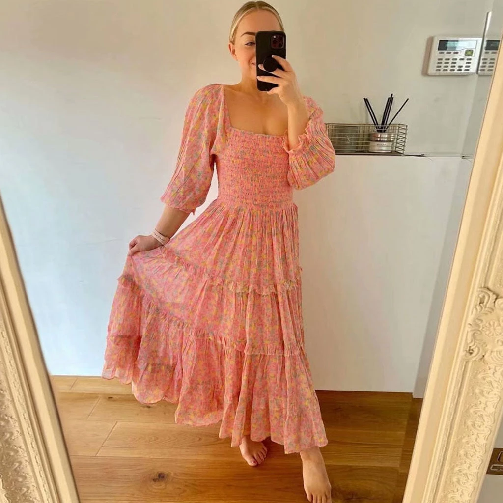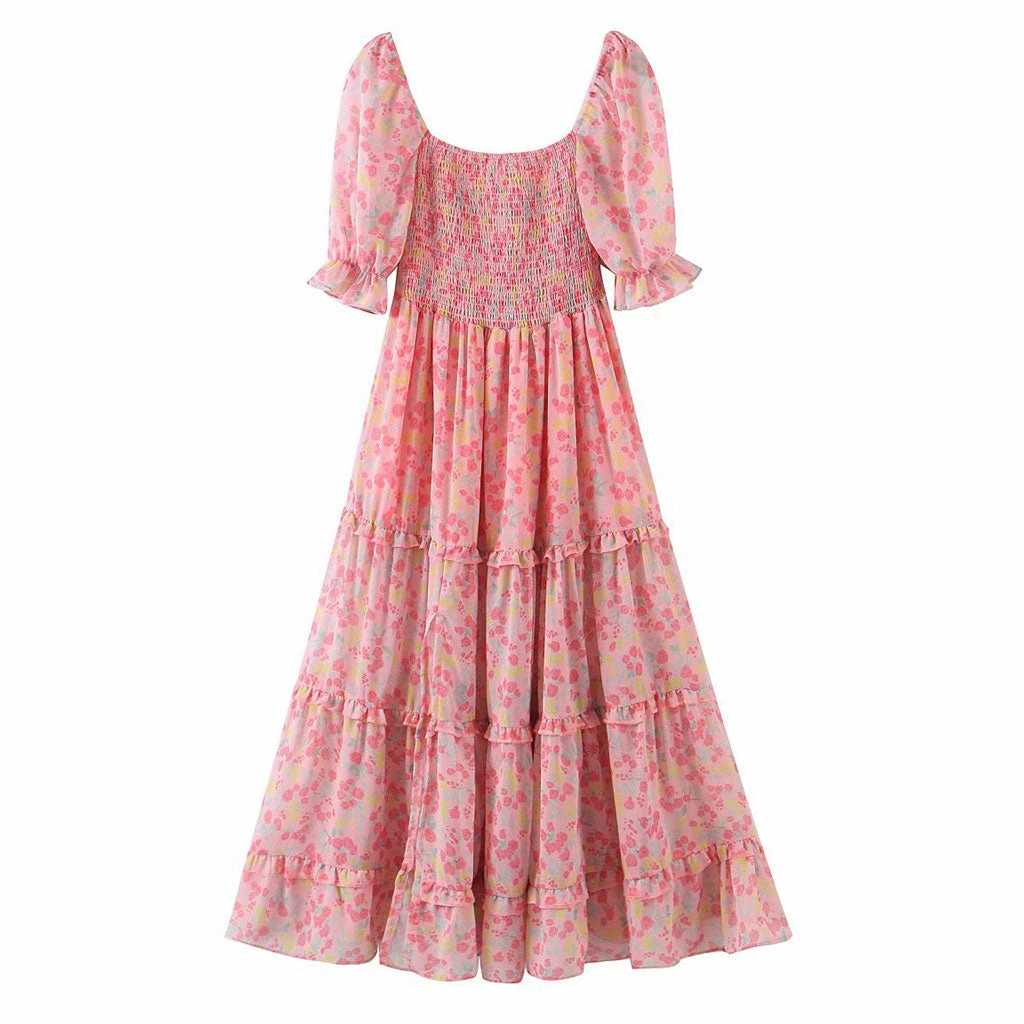 Make a statement this season with this cute smock dress. Made from viscose fabric and polyester, stand out in flower patterns throughout, featuring a square neckline structured with ruffled puffy sleeves, a fit-and-flare cut tailored with a shirred bodice and an A-Line skirt cut, stringy-selvedge details around the silhouette, and a mid-calf length accented with a dramatic side slit. Find more unique women’s summer dresses or trendy clothing in our boutique, and complete a sweet French style with high sandals and heeled boots.
