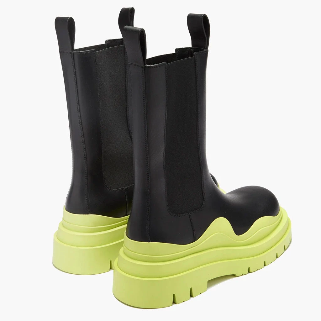 This pair of Chelsea boots lends a subtle pop of color without overpowering the rest of your outfit. Crafted with PU leather, acrylic and rubber, embellished with extra thick, serrated lug rubber soles that extend around the feet to enhance the chunky profile, featuring a calf height silhouette with a slip-on styling and round toes to the front. Find more unique women’s boots and trendy shoes in our boutique, and add a little edge to a bright and playful dress – Heel height: 5 cm.