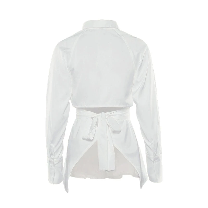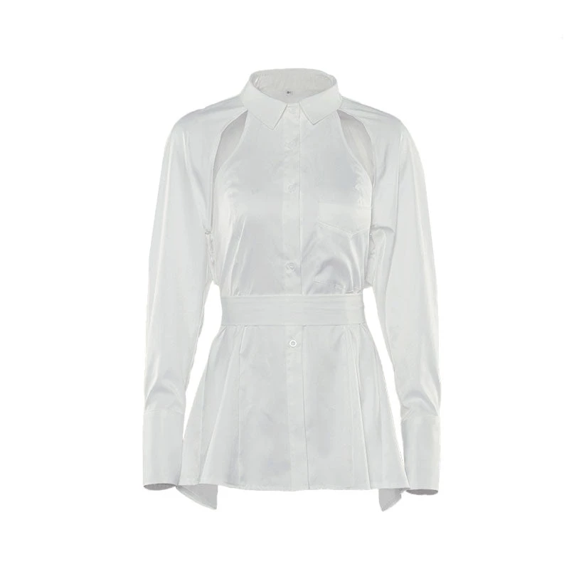 Elevate your going-out look with this iconic style button-down. Made of cotton blend and polyester fabric in solid color, embellished with dramatic cutouts at front and back, a fold over collar along with a button placket and a patch pocket to the front, a self-tie belt at the waist, raglan long sleeves tailored with button cuffs, and a rear slit tailored with a button closure. Find more unique women’s blouses or trendy clothing in our boutique, and style it with your denim, slingback pumps, a shoulder bag and gilded jewelry for an unexpected fashion-girl look.