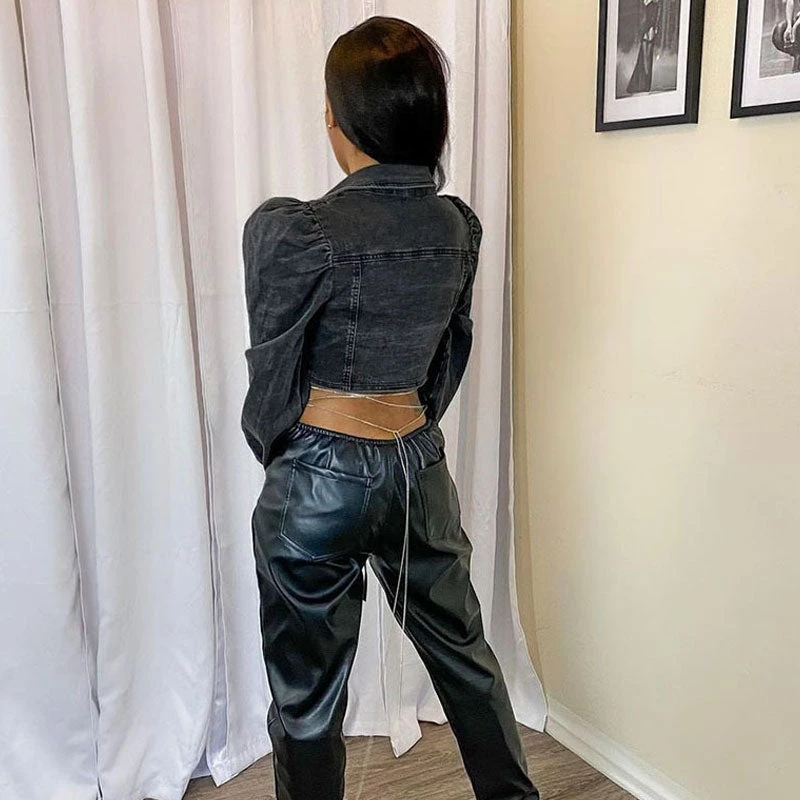 This vintage style denim jacket will instantly become a new wardrobe staple. Crafted with blend denim and polyester, stand out in drawstring ties with ruched details to the front, featuring a boxy fit cut structured with a fold-over collar, a button placket to the front, puffy sleeves trimmed with frill details, and a mini length accented with a bare midriff cut at the waist. Find more trendy women’s denim jackets or unique clothing in our boutique, and wear it on its own, or style it with anything-depending on the look you want.