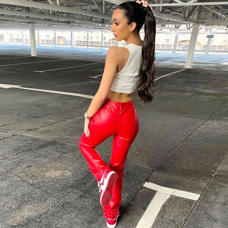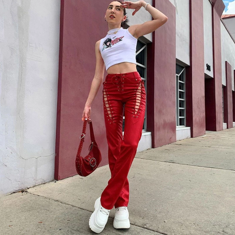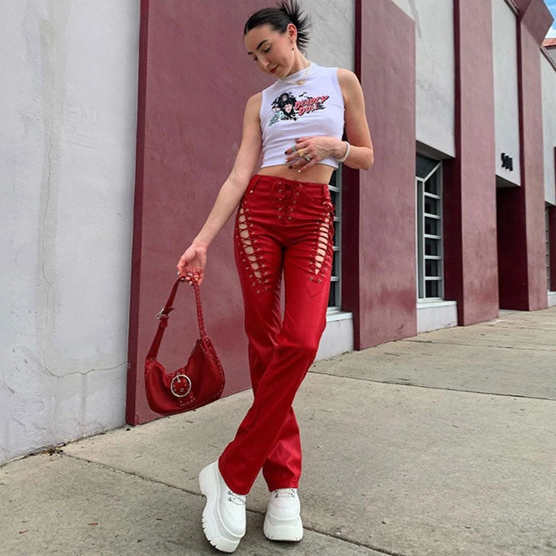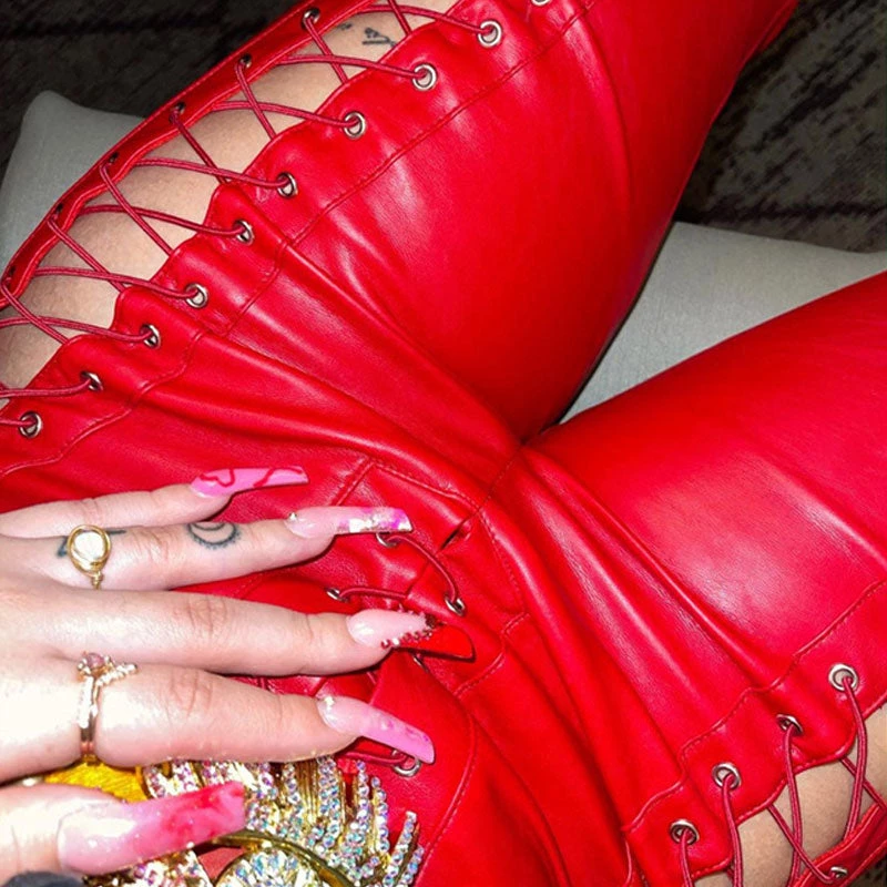 Elevate your nightwear look easily with this pair of leather pants. Made of stretch faux leather in solid color, stand out in cascading side cutouts with lace-up closures, featuring a high rise waistband along with belt hoops, a lacing closure to the front, and a straight-leg cut framed with on-seam cuffs. Find more trendy women’s leather pants or unique clothing in our boutique, and style it with a midriff top and a pair of sneakers for an outstanding look.