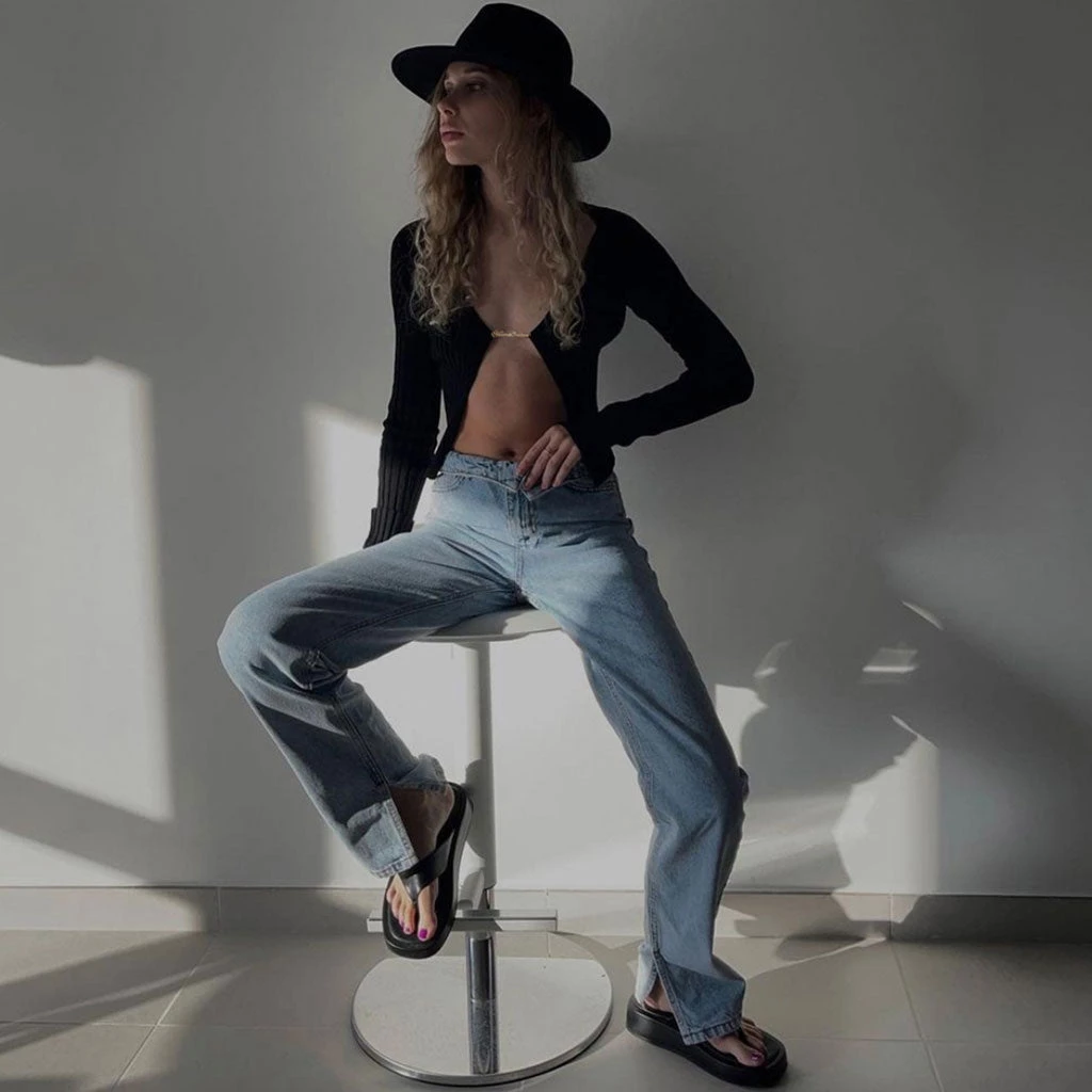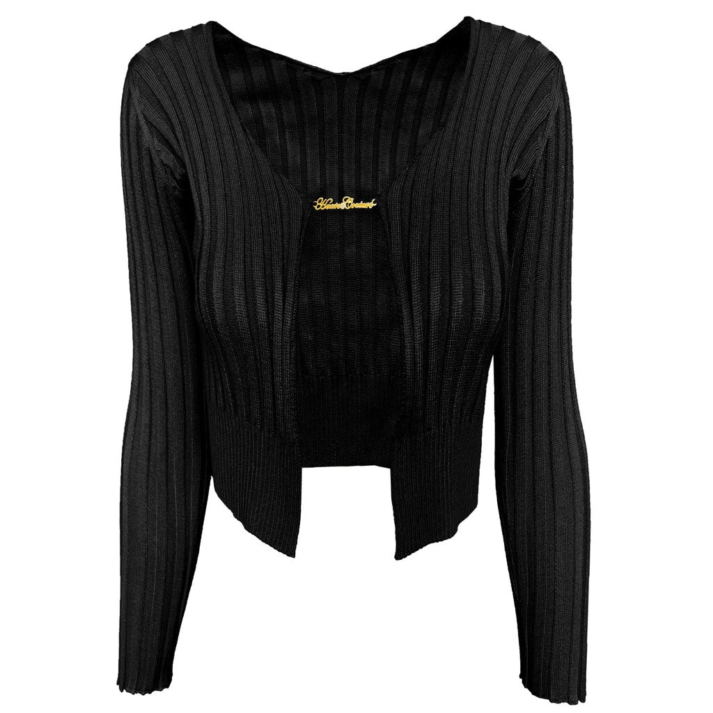 This cropped cardigan is cozy and unique. Made of soft ribbed jersey and polyester fabric, embellished with a gold-tone letter hardware trimmed on the open front, featuring a relaxed fit cut structured with a V neckline and a plunging back, a long sleeve styling, and a cropped length accented with a bare midriff cut at the waist. Find more trendy women’s cardigans or fashionable clothing in our boutique, and pair it with a baguette bag and vintage denim for a chic street look.
