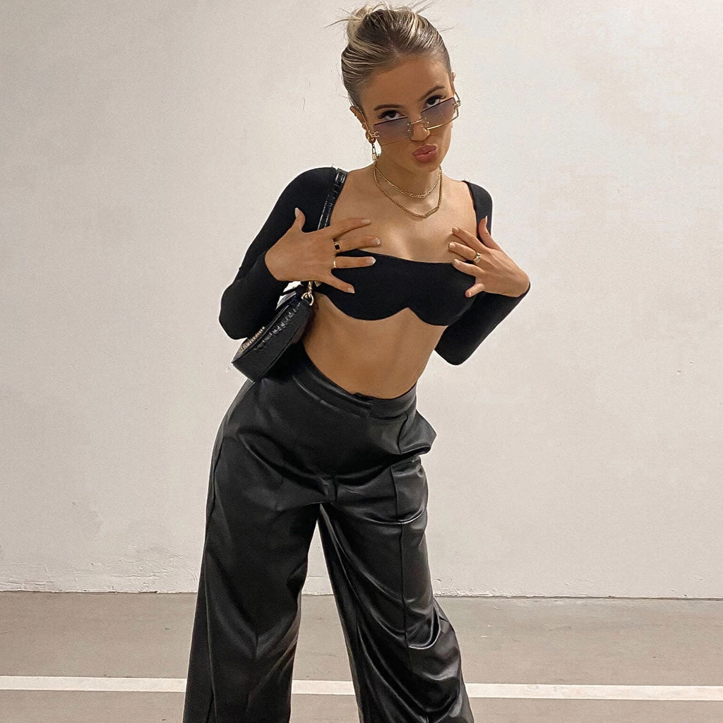This chic t-shirt is such a striking crop. Made of stretchy polyester fabric, embellished with a bralette profile, featuring a slim fit structured with a square neckline, a long sleeve styling, and a cropped length accented with a bare midriff cut at the waist. Find more trendy women’s crop tops or chic clothing in our boutique, and wear it with a pair of high rise jeans and simple pumps for a modern fashion-girl look.