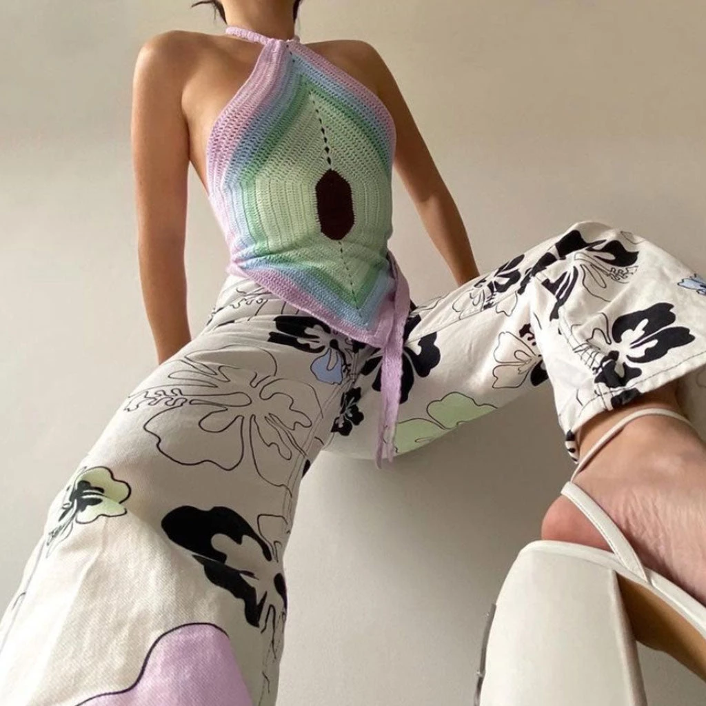 This bright-colored knit crop is perfect for strolling down a sandy beach or enjoying a new outing! Crafted with stretchy jersey and spandex, embellished with a pointelle handkerchief profile in color panel, featuring a halter neck along with a tie on the neck, a backless styling tailored with a rear tie, and ended up with an asymmetric hem. Find more unique women’s knit tops or trendy clothing in our boutique, and complete it with anything-depending on the look you want.