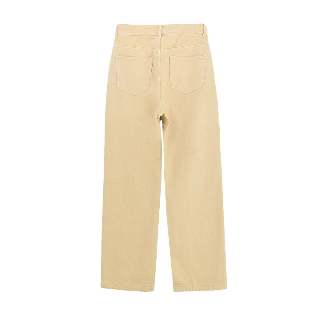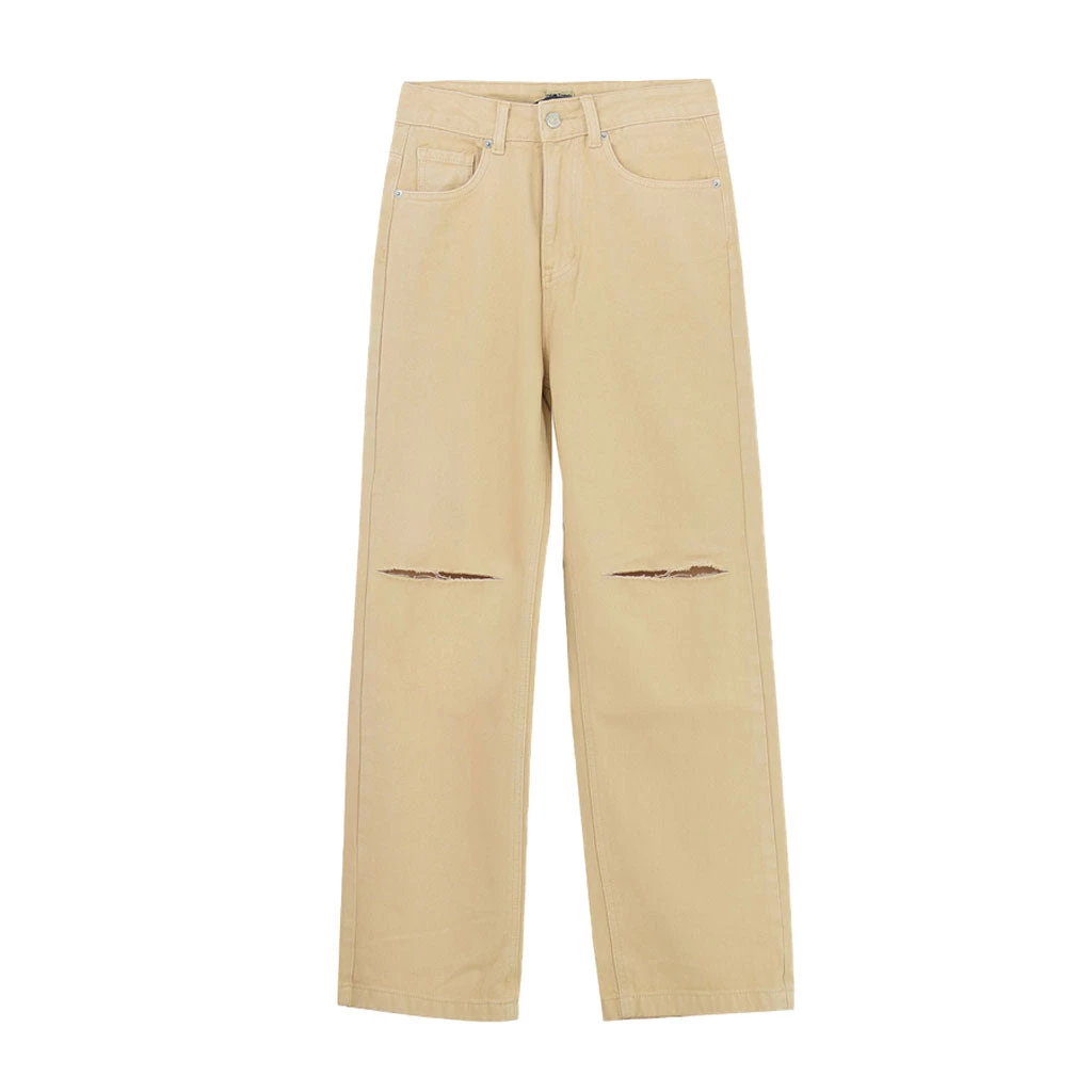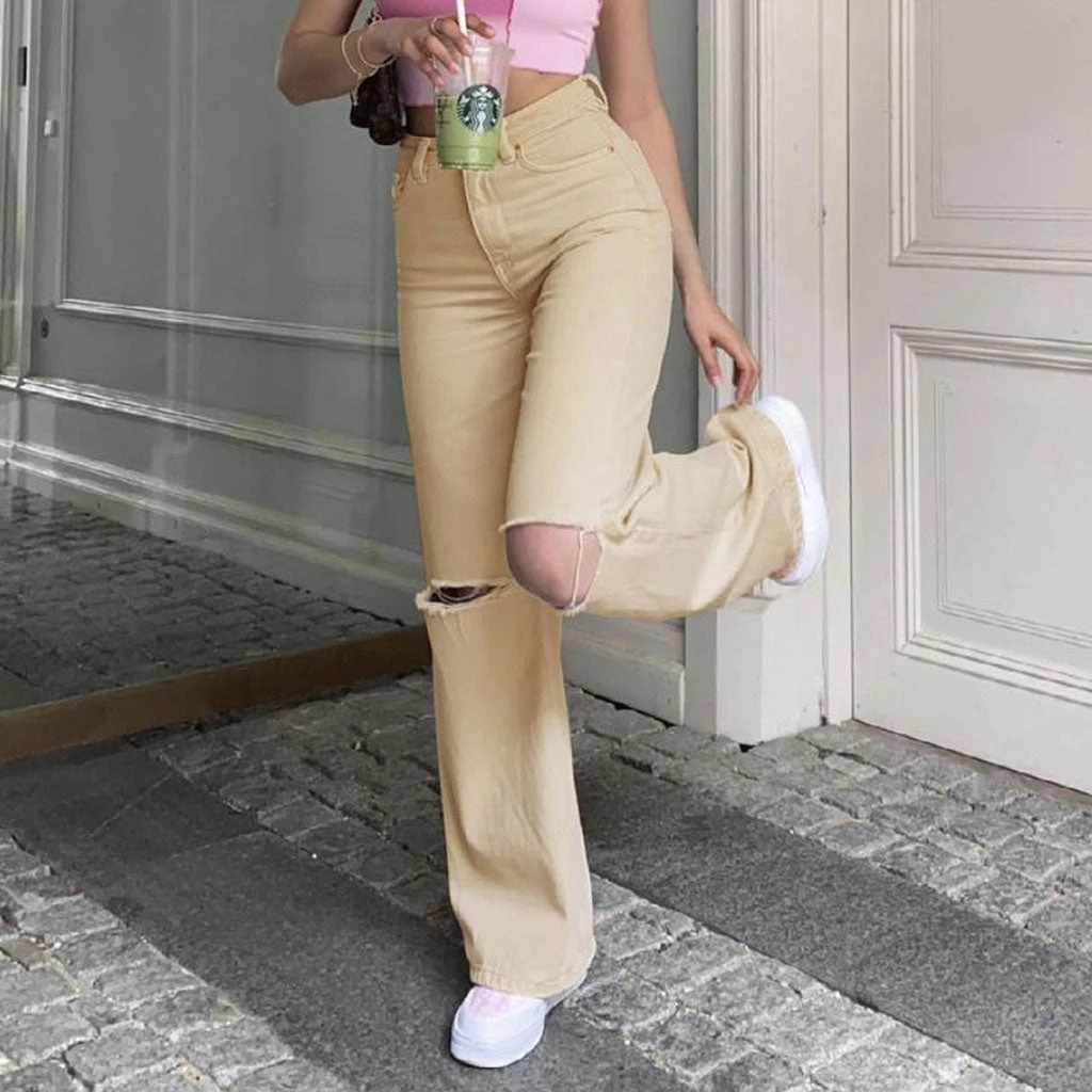 A pair of vibrant jeans will give you a cool throwback feel. Made of blend denim and polyester, embellished with shredded holes at knees, featuring a high rise waistband trimmed with belt loops, a button closure along with a concealed zip fastening to the front, classic five pockets, a straight-leg cut structured with the particularly long hems and wide cuffs. Find more unique women’s jeans or trendy clothing in our boutique, and keep things casual with a favorite bright-color midriff top and a pair of sneakers.