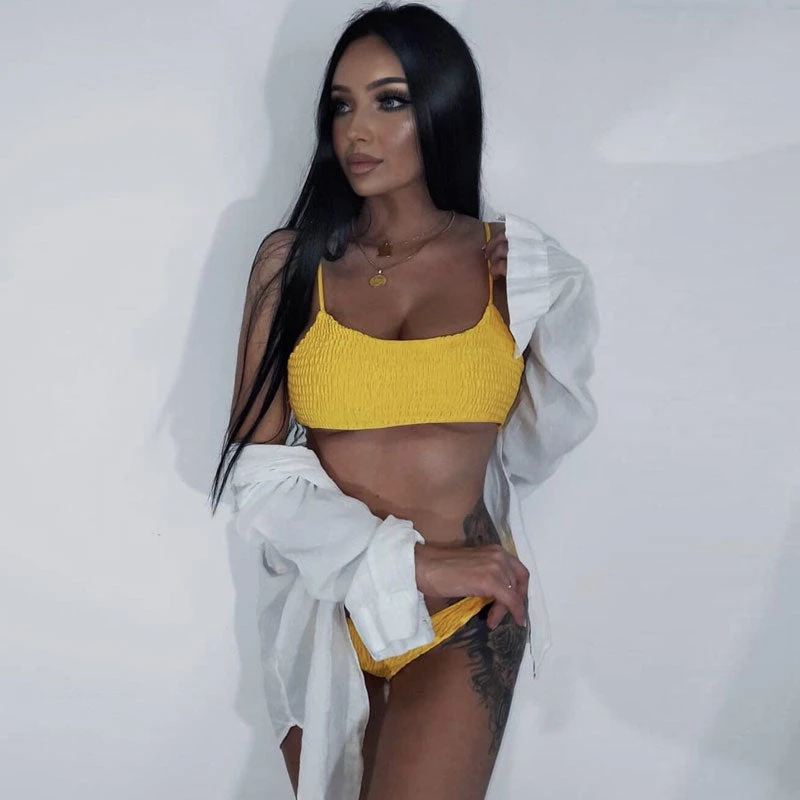 Trendy & Unique Vintage Floss Strap High Leg Shirred Bralette Bikini Set – Yellow