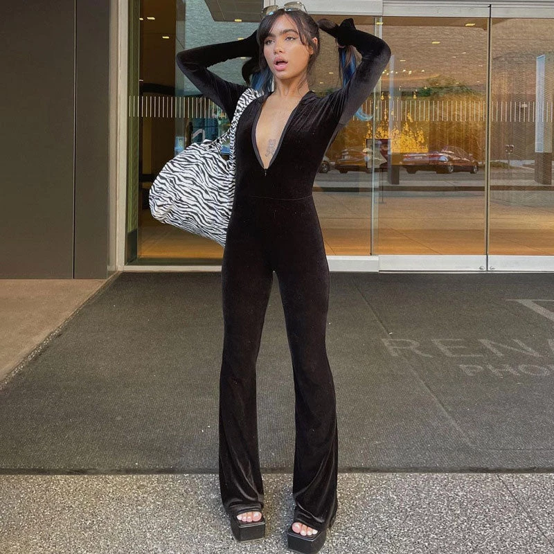 This all black jumpsuit will forever be one of your favorite all-in-one pieces this fall and winter. Made from velvet and polyester blend, stand out in long sleeves along with thumb holes, featuring a front zip fastening tailored with a hood, and a fit-and-flare cut structured with the particularly long wide hems and frayed edges. Find more trendy women’s jumpsuits or unique clothing in our boutique, and accessorize with either a pair of chunky heels or stiletto boots for a retro-inspired street look.