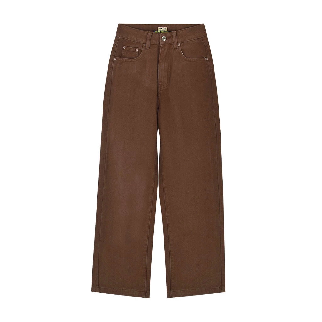 This vibrant pair of jeans is a good option go-with for your fun tops. Made of blend denim and polyester, embellished with an all-over chocolate color, featuring a high rise waistband trimmed with belt loops, a button closure along with a concealed zip fastening to the front, classic five pockets, a straight-leg cut tailored with particularly long hems and wide cuffs. Find more trendy women’s jeans or unique clothing in our boutique, and have a ’90s-inspired look with a tone color midriff top and a pair of sneakers.