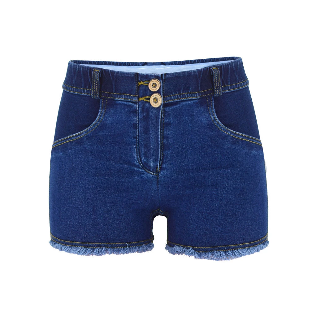 Show off your killer curves with this pair of elevated denim shorts. Made of blend denim and polyester in dark blue color, embellished with a straight leg cut accented with front frayed details, featuring a high rise waistband trimmed with belt loops, a two-button closure along with a concealed zip fastening to the front, classic front pockets along with mock rear pockets. Find more unique women’s denim shorts or trendy clothing in our boutique, and style it with anything-depending on the look you want.