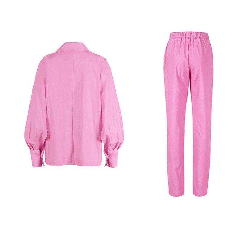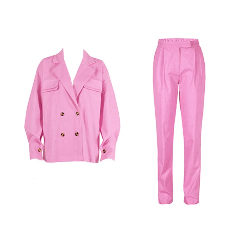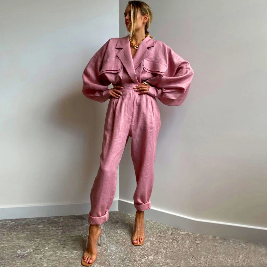 Achieve a slant-to-laid-back in this unique pant set. Created with linen blend and polyester fabric in solid color, embellished with cargo flap pockets to the front, featuring an oversized blazer with peak lapels, a double-breasted placket to the front, loose sleeves tailored with buttoned cuffs, and complete an athflow two piece set with a pair of high rise tapered pants tailored with hook & eye closures with a concealed zip fastening at front, slanted pockets along with pleats detail. Find more trendy women’s matching sets or clothing in our boutique, and go for styling with high heels and slides alike.