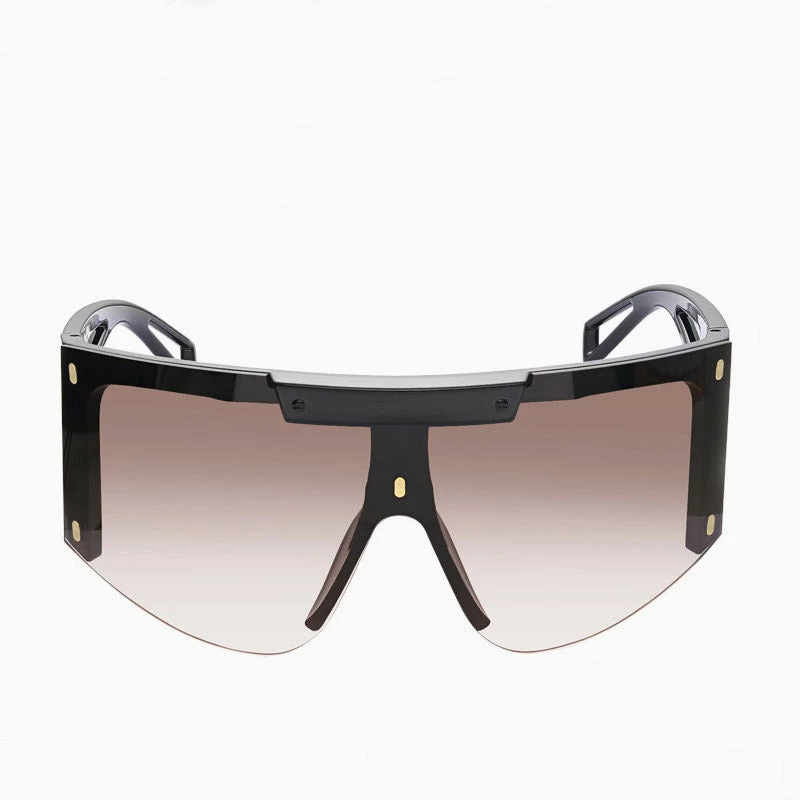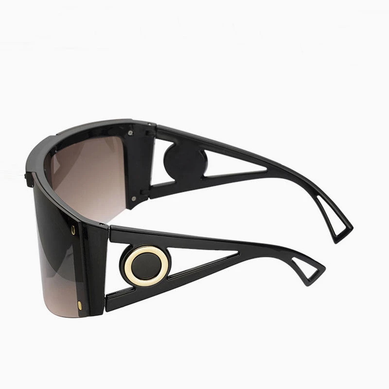 This futurist pair of sunglasses gets you noticed everywhere. Crafted from lightweight polycarbonate material, embellished with an oversized frame in a shield styling, featuring aviator shaped brown tinted lenses and curved arms and cutouts. Find more unique women’s sunglasses and trendy eyewear in our boutique, and wear it to hide your dark circles from last night’s party easily.