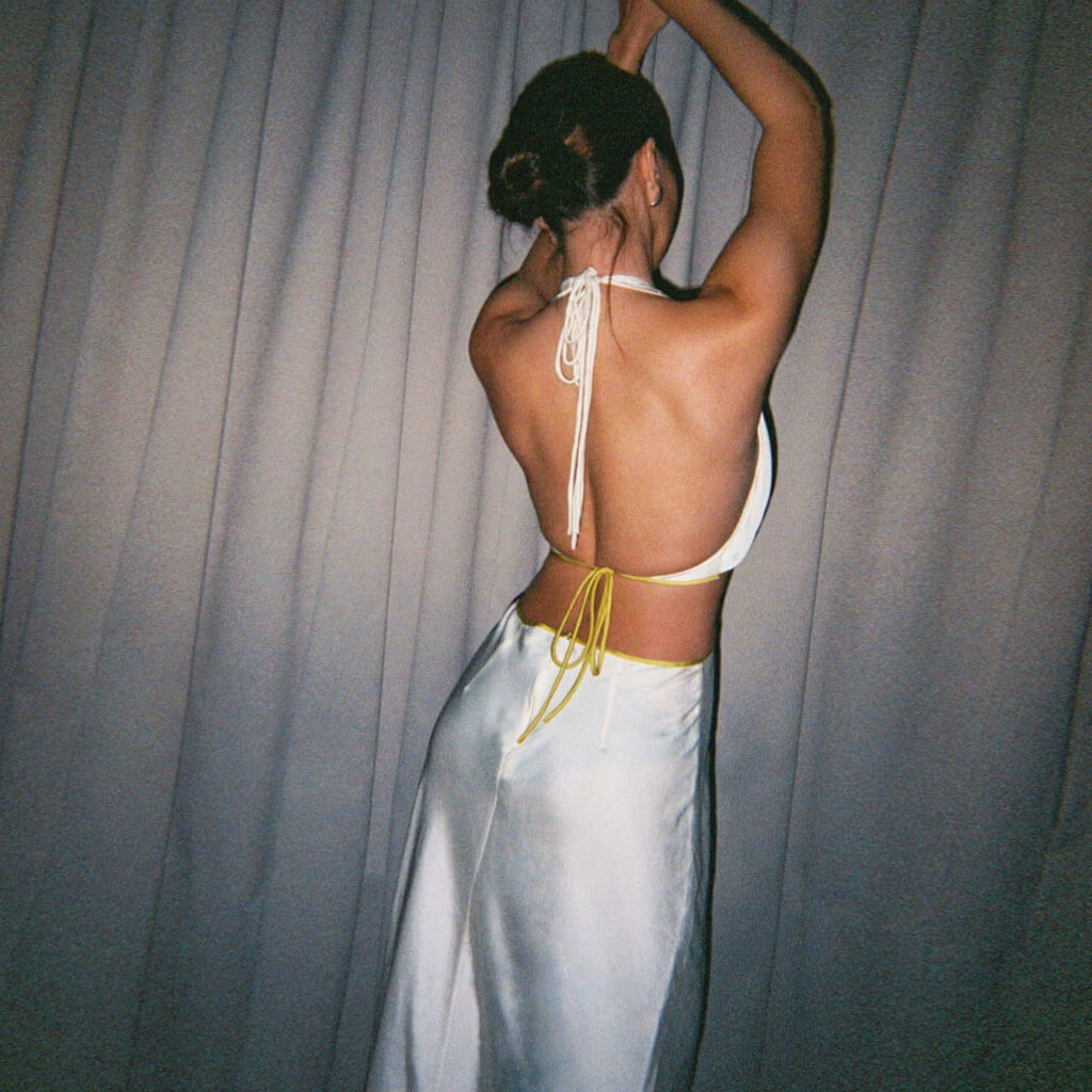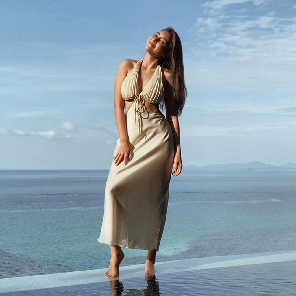 Style out your weekend in this silky satin halter dress! Crafted with silky satin and polyester fabric, embellished with a mock-two-piece profile, featuring a flattering fit cut structured with a deep plunging neckline, pleats on cups, self-tie closures on the neck, the front and the back, a cut-out at the waist, and a concealed zip fastening to the rear, and ended up with a particularly long length. Find more unique women’s cocktail party dresses or trendy clothing in our boutique, and look just as good with party heels as it does with flat slides.