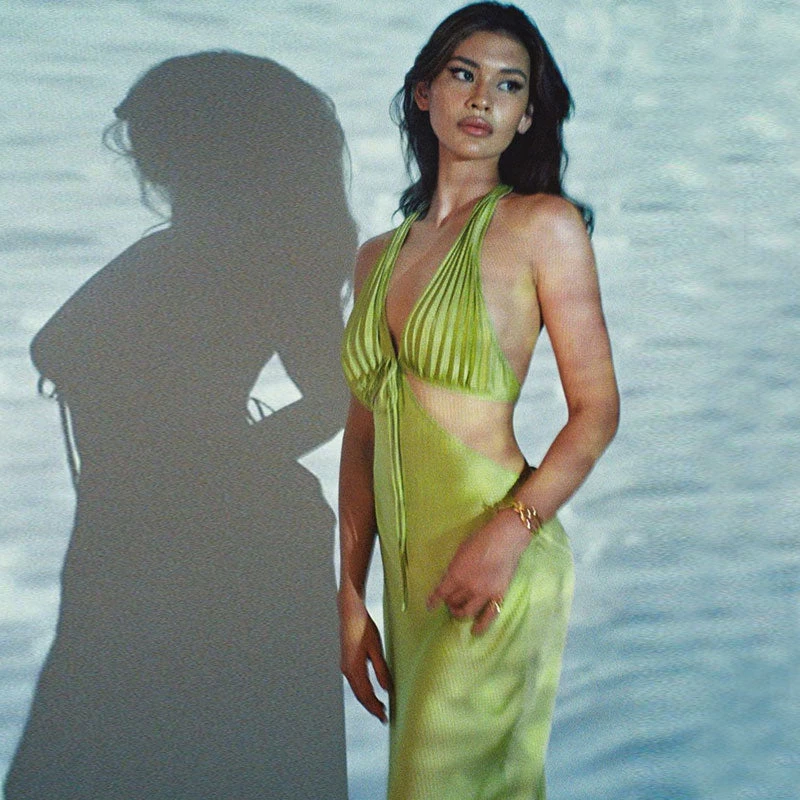 Style out your weekend in this silky satin halter dress! Crafted with silky satin and polyester fabric, embellished with a mock-two-piece profile, featuring a flattering fit cut structured with a deep plunging neckline, pleats on cups, self-tie closures on the neck, the front and the back, a cut-out at the waist, and a concealed zip fastening to the rear, and ended up with a particularly long length. Find more unique women’s cocktail party dresses or trendy clothing in our boutique, and look just as good with party heels as it does with flat slides.
