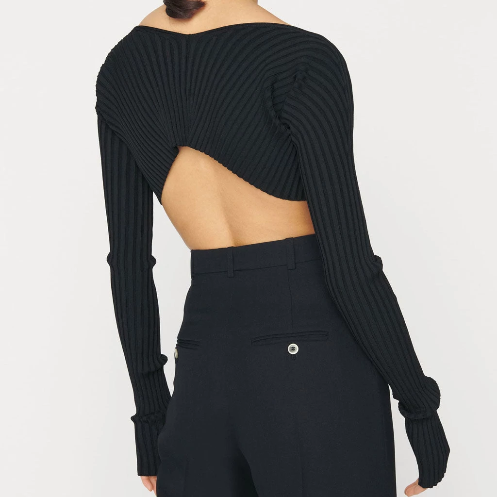 This cropped cardigan is cozy and weird. Made of soft ribbed jersey and polyester fabric, stand out in a super cropped length accented with a bare midriff cut at the waist, featuring a relaxed fit cut structured with a V neckline and a plunging back, a gold-tone letter hardware trimmed on the open front and a long sleeve styling. Find more trendy women’s cardigans or unique clothing in our boutique, and pair it with a matching baguette bag and high rise denim for a modern chic street look.