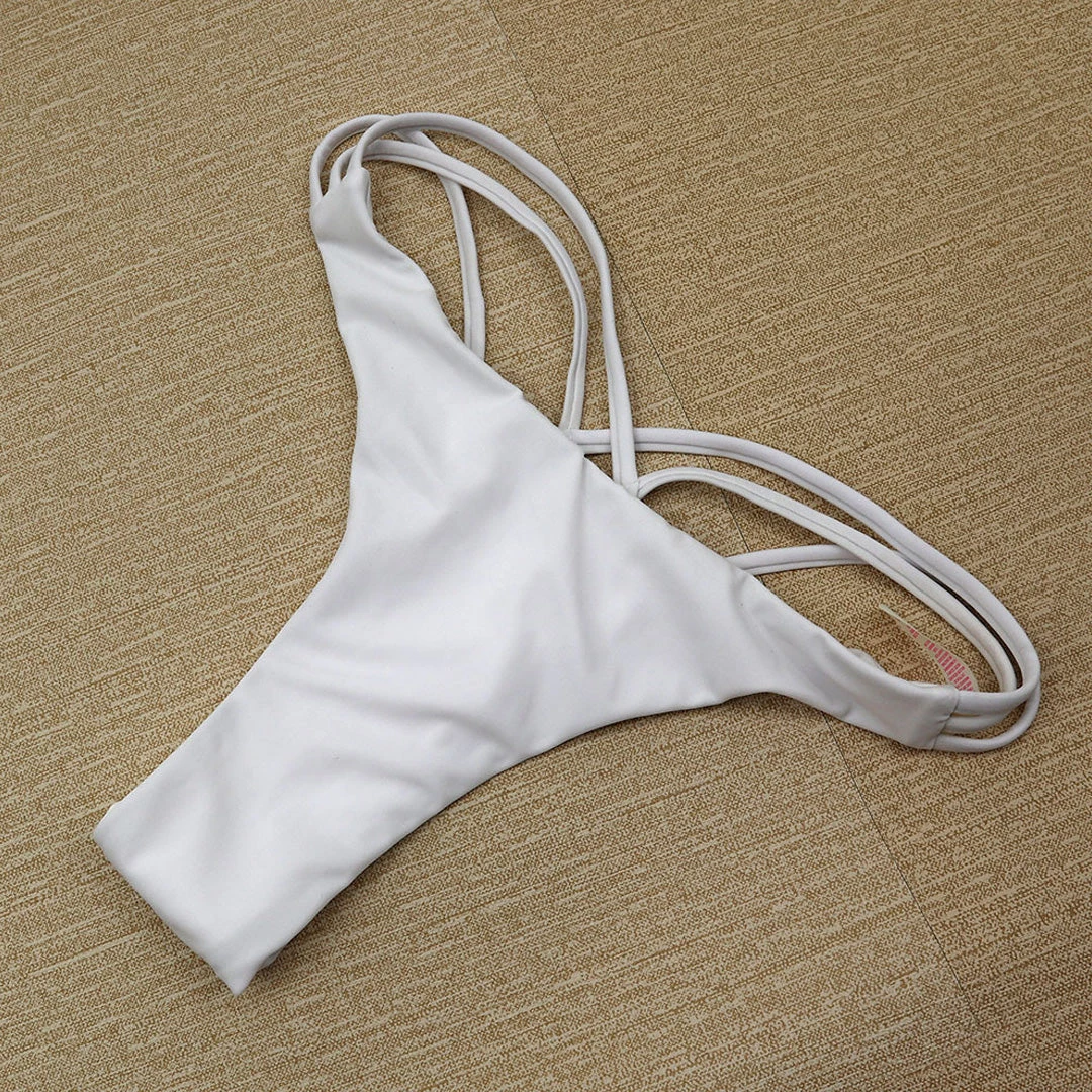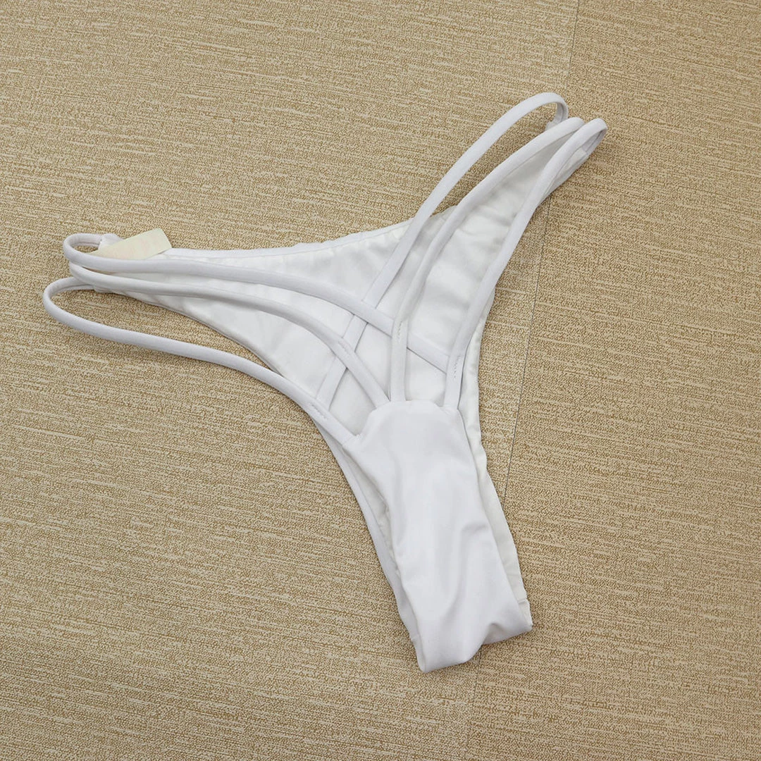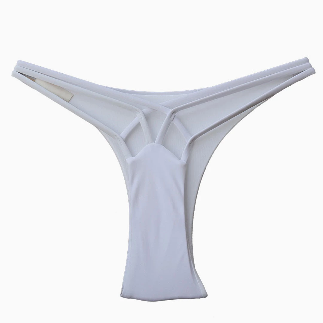 Create a sexy Brazilian profile with this sexy bikini bottom. Made of polyester and elastane, stand out in cross-cross straps to the rear, featuring a low rise design in thong styling, skimpy fit coverage punctuated with full lining. Find more women’s bikini bottoms or unique swimwear in our boutique, and finish a trendy bikini set with a solid color bikini top.