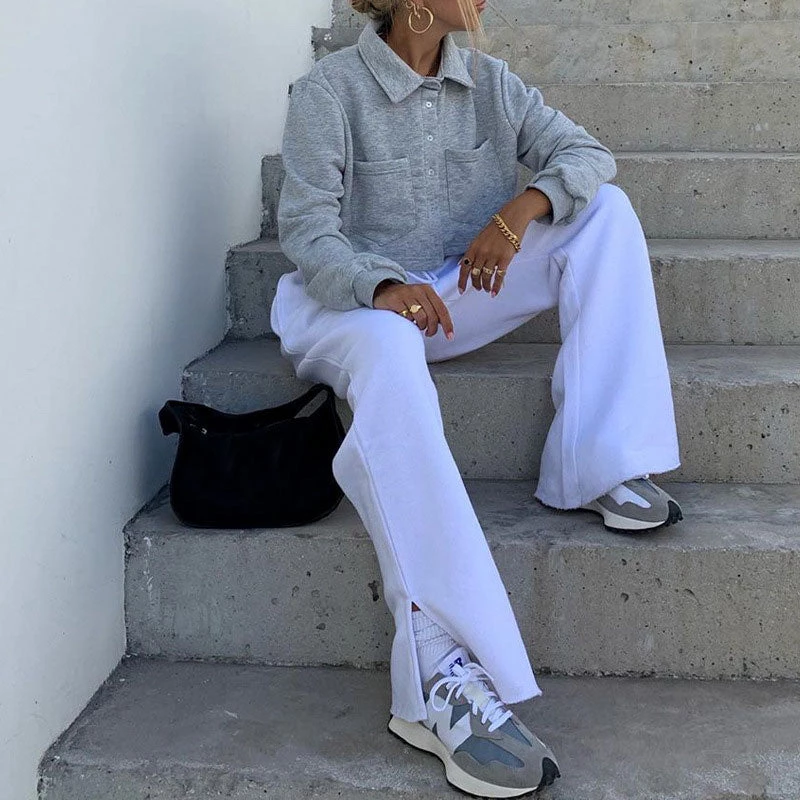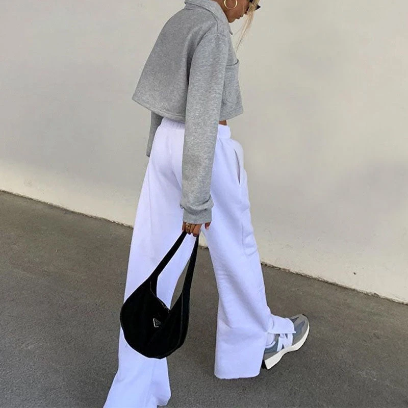 This pair of athflow pants is perfect for lounging around the house in—and yes, even wear out. Made from cotton blend and polyester in solid color, embellished with wide cuffs accented with side slits, featuring a covered elastic waistband with a front drawstring, a wide-leg cut along with side pockets and ended up with particularly long lengths. Find more trendy women’s matching sets or unique clothing in our boutique, and go for styling with sneakers for an athletic street look.