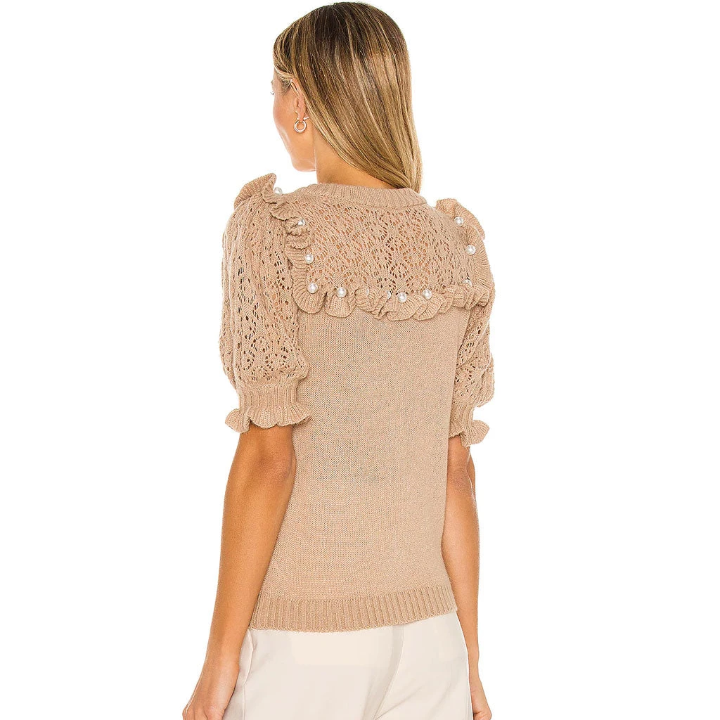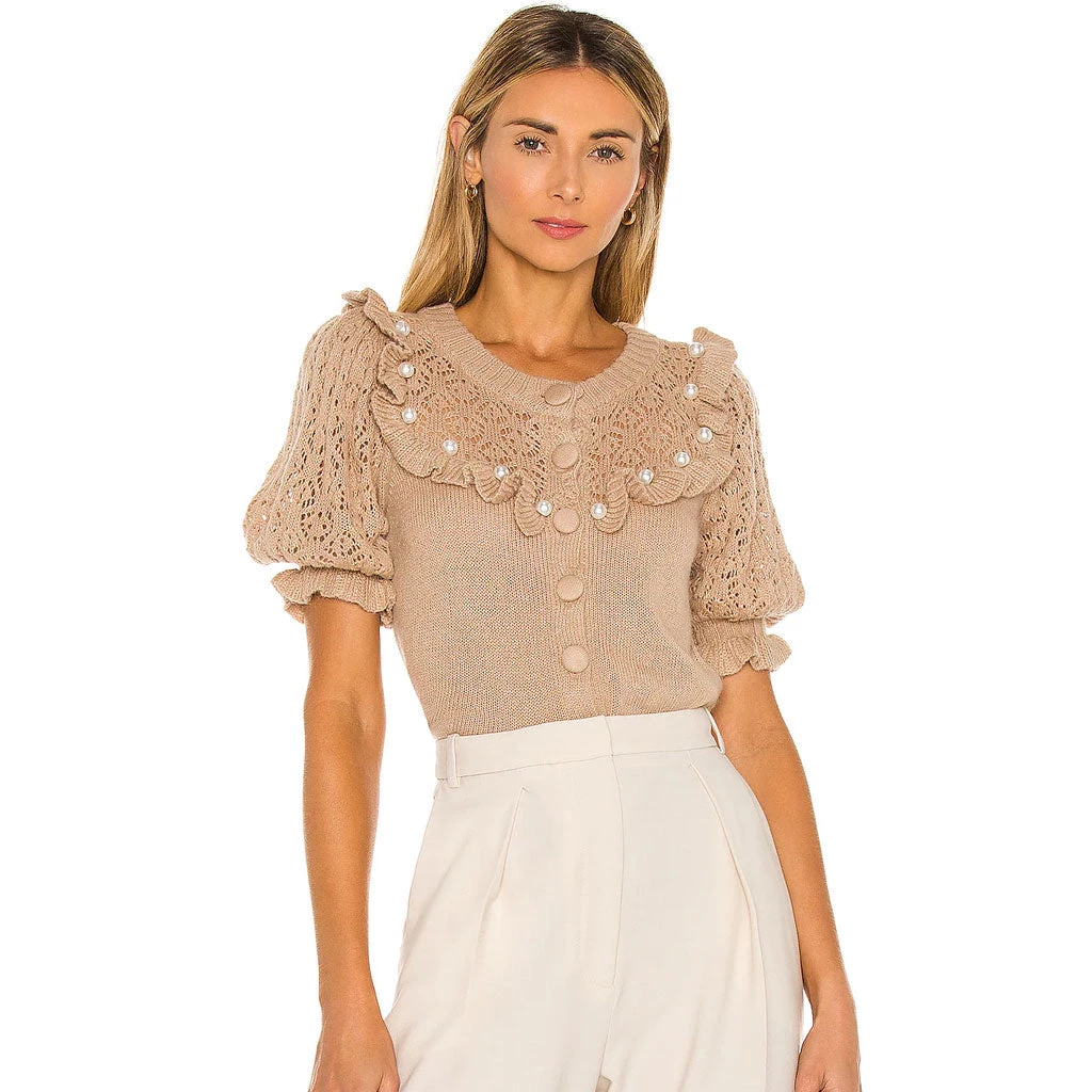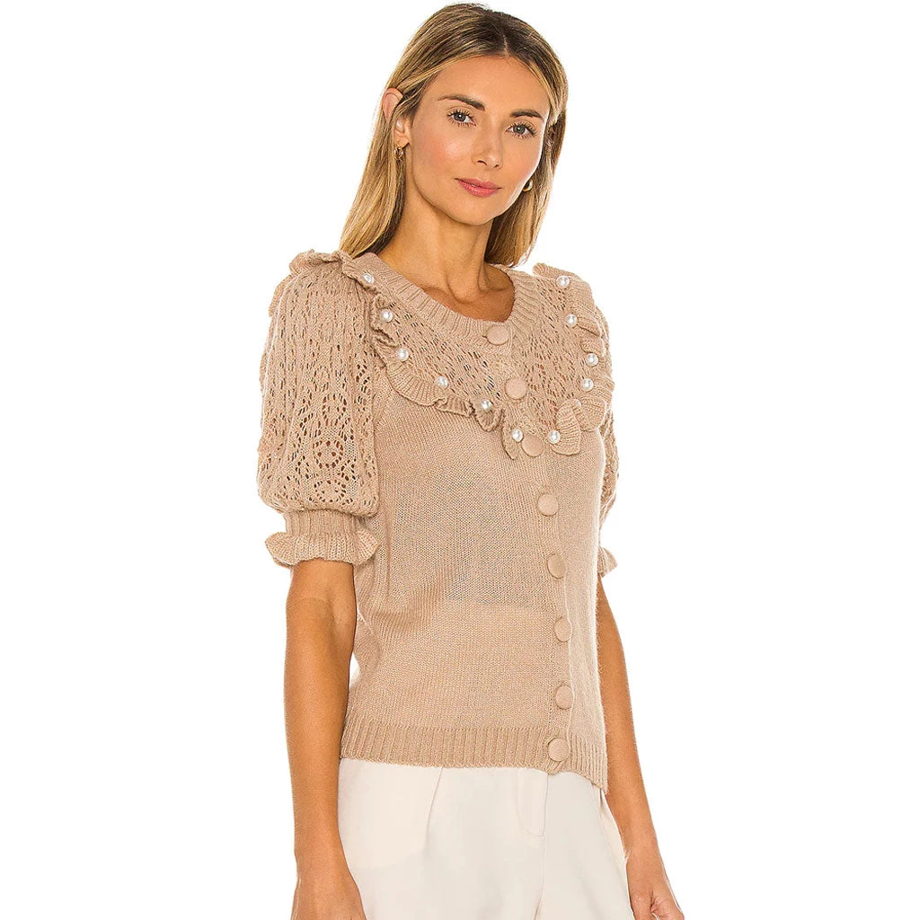 Good-looking crochet knitwear makes you equally radiant at work. Crafted with blend acrylic and polyester, embellished with white beads and round covered buttons front middle, featuring an elegant fit cut structured with a ribbed round-shape neckline, crocheted up front with ruffle tailored and loose short sleeves with petal-roll ribbed trim, and a regular length accented with a ribbed hem. Find more trendy women’s sweaters or unique clothing in our boutique, and layer it with everything-depending on the look you like.
