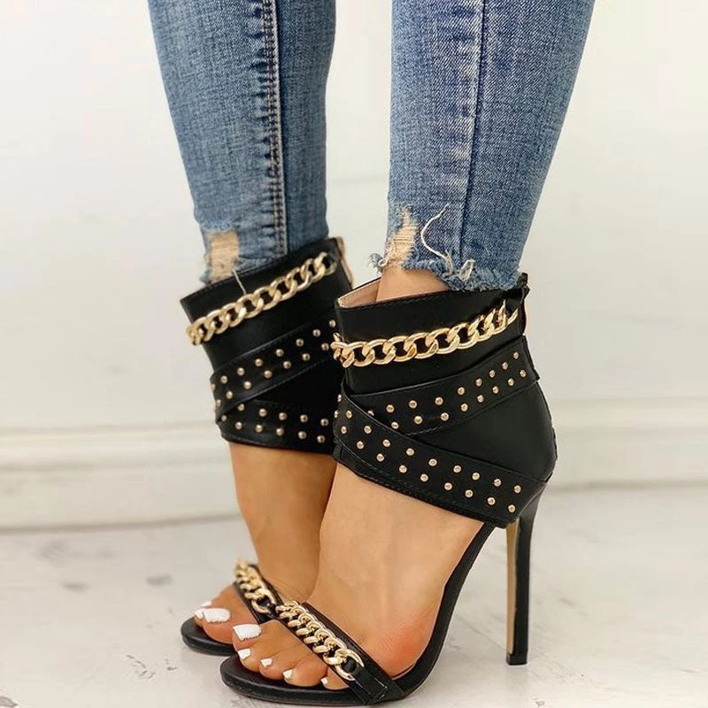 Say hi to your go-to sandals. Crafted with PU leather and rubber, stand out in metallic rivets embellished to the vamp, featuring an ankle bootie styling with a chunky chain, an open toe to the front and a zip fly to the rear, and stiletto heel soles along with rubber heel caps. Find more trendy women’s sandals and unique shoes in our boutique, and wear yours with a pair of skinny jeans for a street look – Heel height: 11 cm.