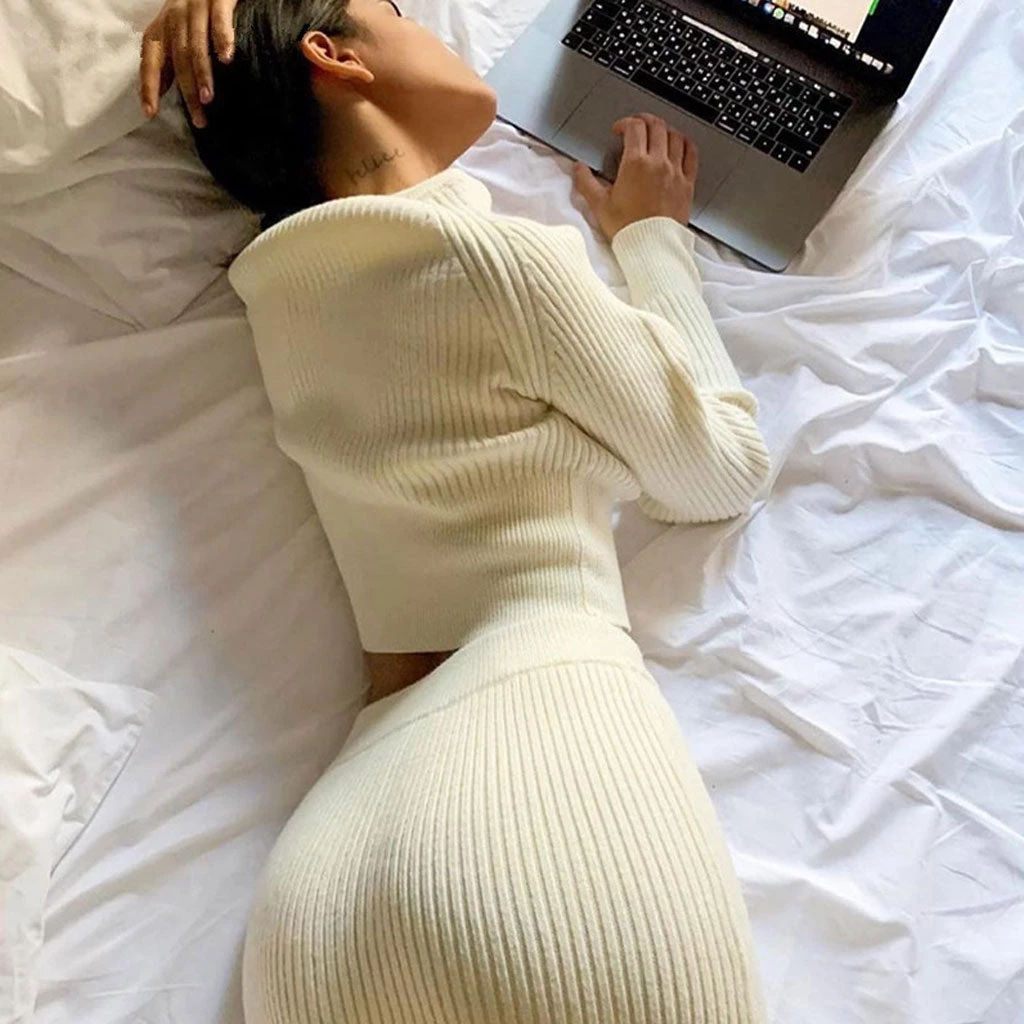 This knit skirt set is simple but effective. Made of blend acrylic and polyester in solid color, embellished with an allover ribbed profile, featuring a pullover sweater structured with a crew neck and a long sleeve styling tailored with flare cuffs, complete a street style two piece set with a high rise midi skirt hugging your curves like a glove. Find more trendy women’s matching sets or unique clothing in our boutique, and layer it with all your fancy sneakers and boots!