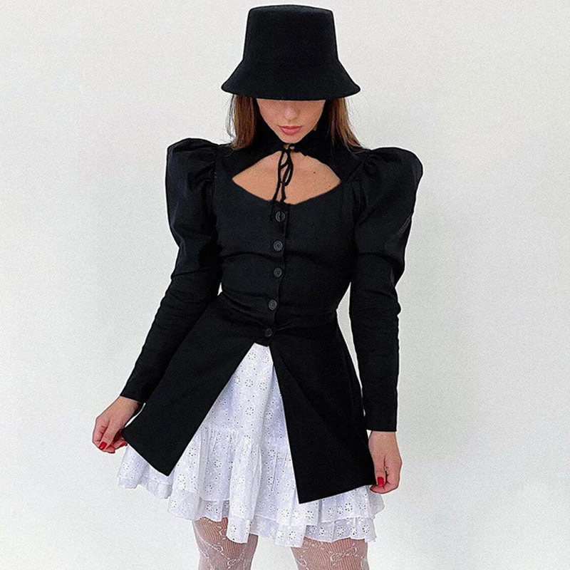 This little black top is really adorable. Made of polyester fabric in solid color, stand out in puffy sleeves trimmed with frill details, featuring a high collar with flouncing edges tailored with a self-tie, a cutout detail along with a button placket to the front, and a particular length accented with a front slit. Find more unique women’s blouses or trendy clothing in our boutique, and just match everything, depending on the look you want.