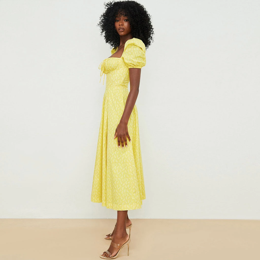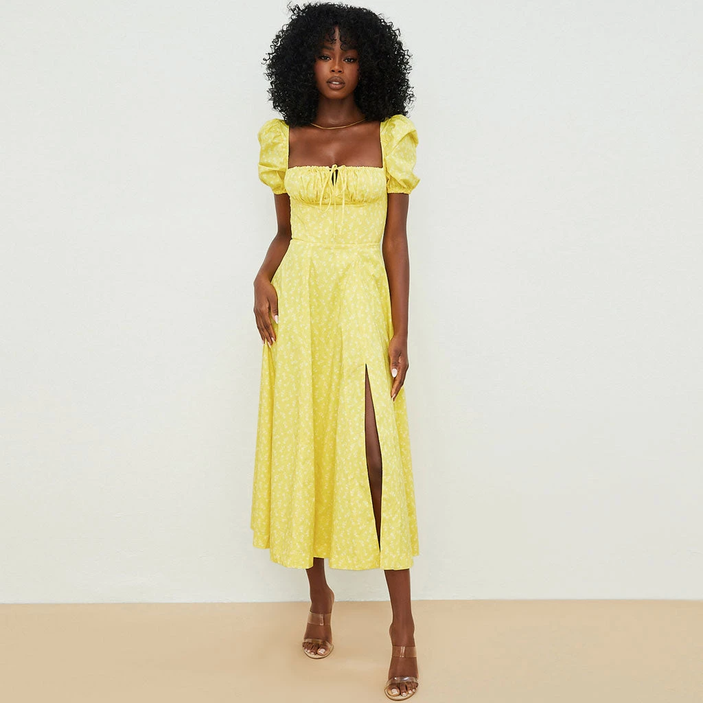 Go ahead and get a little risky with this cute and sexy printed sun dress. Made from cotton blend fabric and polyester, stand out in flower patterns throughout, featuring a square neckline structured with a ruched trim drawstring tie and a keyhole at the chest, a fit-and-flare cut tailored with covered elastic puffy sleeves, a rear zip fastening, and the particularly long length accented with a dramatic side slit. Find more unique women’s summer dresses or trendy clothing in our boutique, and complete a sweet French style with high sandals in sunny days or toss on a jacket and heeled boots in fall and winter.