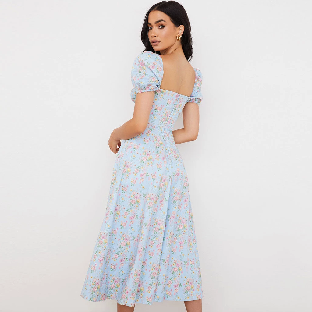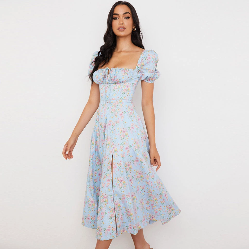 Trendy & Unique What’s New Daisy Printed Puff Sleeve High Slit Smock Maxi Sundress – Light Blue
