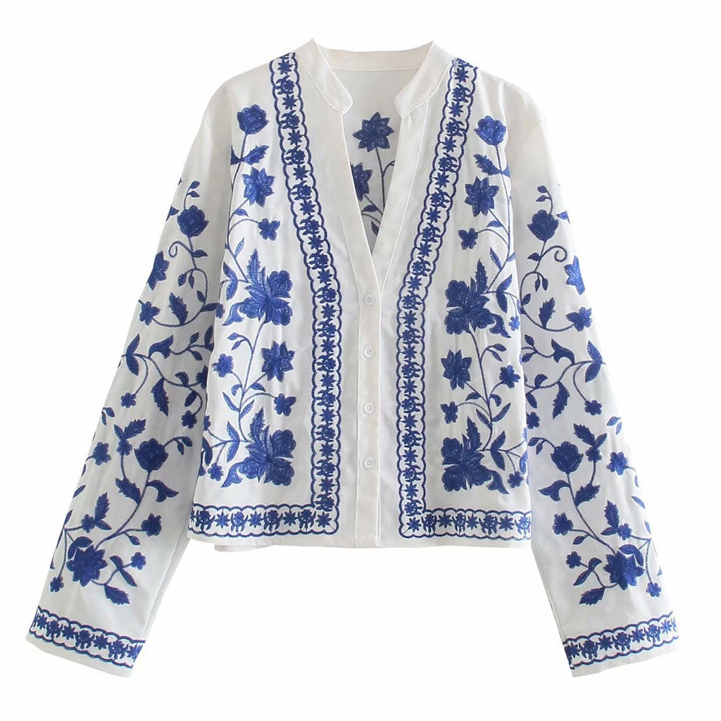 Floral blouses are having a major moment right now, and with this top, so pretty! Crafted with blend cotton and polyester, embellished with contrasting flower embroidery throughout, featuring a straight fit structured with long sleeve styling, a split-V neckline along with a button placket to the front and a straight hem. Find more unique women’s blouses or trendy clothing in our boutique, and wear it with vintage denim and simple heels.