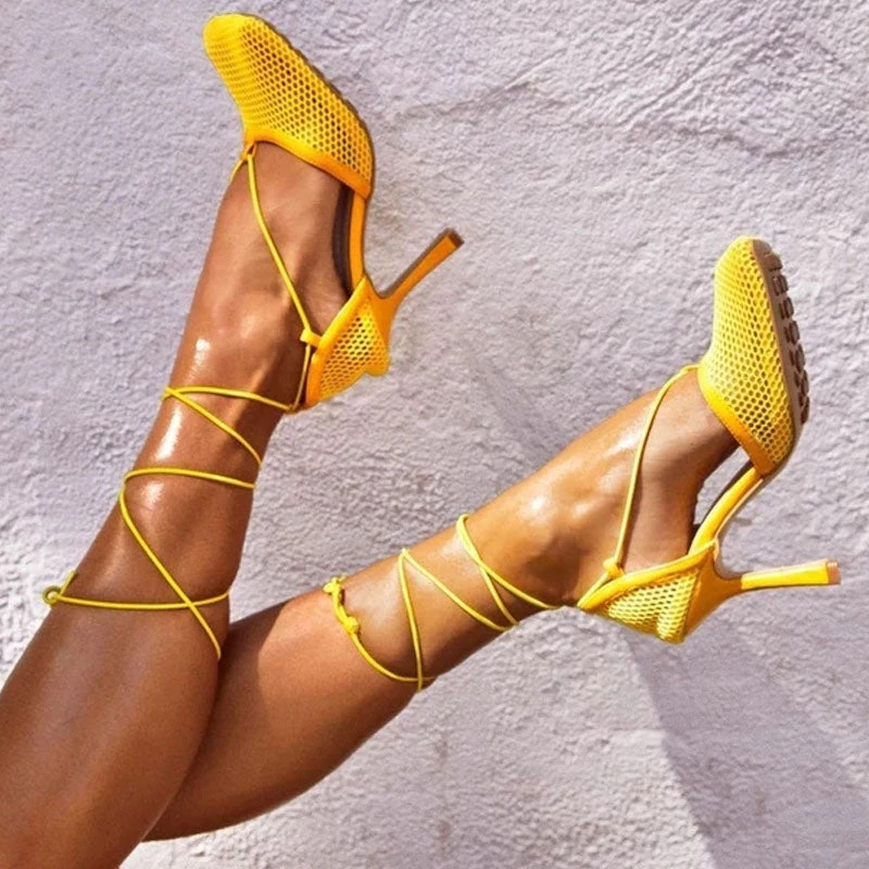 Trendy & Unique What’s New Eye-Catching Strappy Square Toe Mesh High Heel Sandals – Yellow