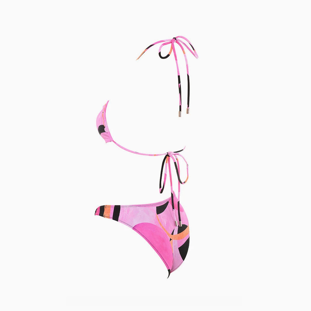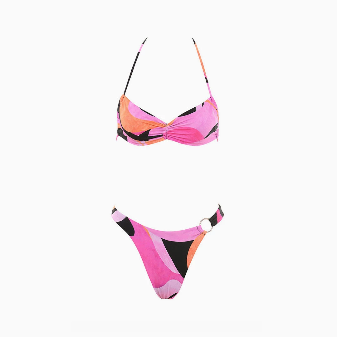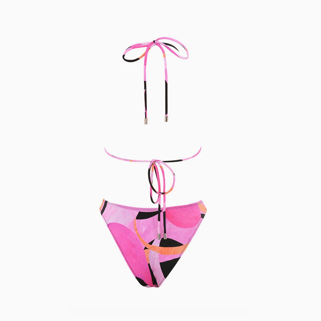 Get ready to turn some heads at the beach in an attractive pastel color two-piece swimsuits. Made from stretchy nylon and spandex, embellished with all-match bright color panel, featuring a sweet swim top with removable pads, trimmed with ruched detailing to the center front, a halter tie along with a back tie for a comfort fit, complete a trendy beach look with a pair of high cut bikini bottom distinguished with metal ring to the side. Find more boutique women’s bikini sets or unique swimwear to bask in the sun.