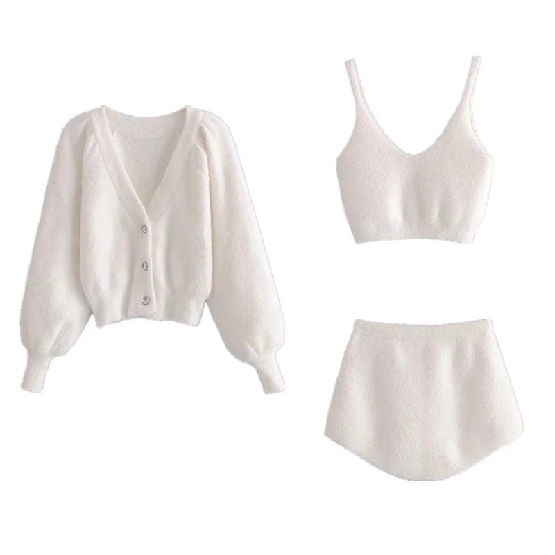 Ultra-soft and cozy, this cute style knit-short set is so fresh. Made of blend acrylic fabric in pure color, embellished with a fuzzy three-piece profile, featuring a cropped length tank top with a bare midriff cut at the waist, a roomy fit cardigan tailored with a plunging neckline, a button placket studded with sparkly rhinestones, bishop sleeves with covered elastic cuffs, complete a sweet style two piece set with a pair of high rise shorts hugging your curve like a glove. Find more trendy women’s matching sets or unique clothing in our boutique, and wear it on its own or layer with others for a chic street look.