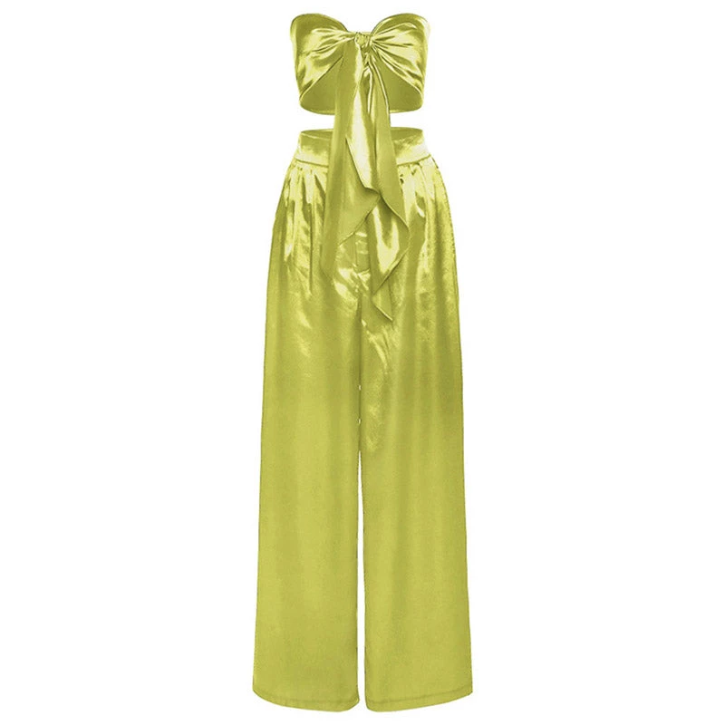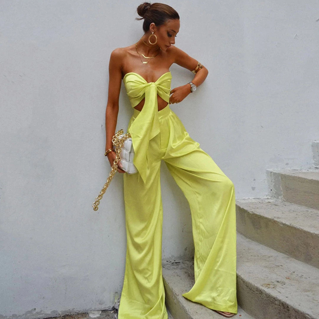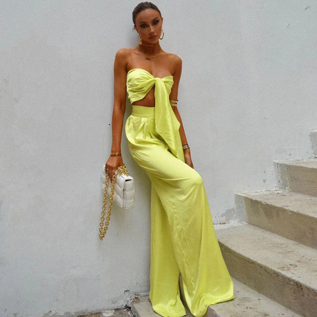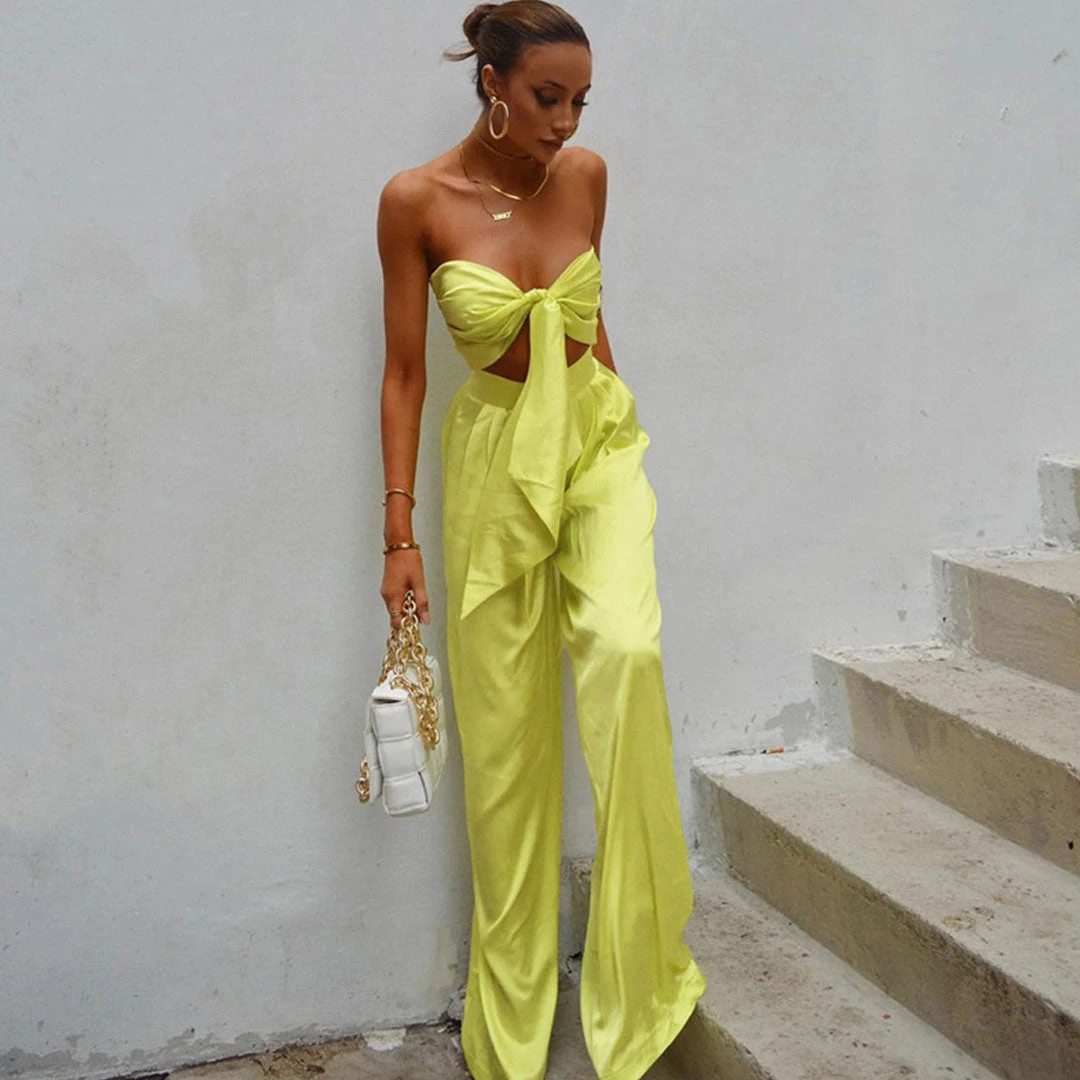 This bright-colored two-piece set is the one you want to wear over & over all summer long, and it will take you seamlessly from the street to the beach. Crafted with silky satin fabric, stand out in a vibrant neon colourway, featuring a playful self-tie strapless top in multi-ways, complete a leisure matching set with a pair of high rise pants accented with long, wide-cut legs. Find more trendy women’s matching sets or unique clothing in our boutique, and pair it with a cute basket bag and high heels for a vibrant outing look.