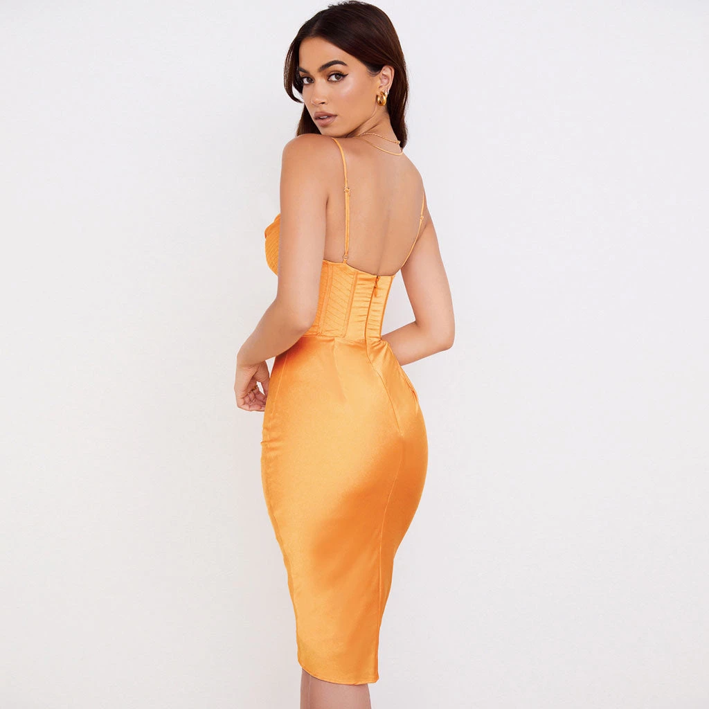 Trendy & Unique What’s New Glossy Satin Cowl Neck Underwire Bustier Corset Midi Dress – Burnt Orange