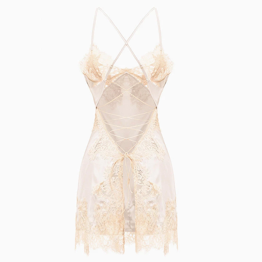 This mini slip dress is both sensual and comfortable. Crafted from stretchy lace, silky-bend satin and nylon, embellished with rear lacing detailing with a back split, featuring a deep plunging necklace, slender adjustable shoulder straps, intricate eyelash lace splicing, a sexy fit and a short hemline. Find more unique women’s nightwear chemises or chic lingeries in our boutique, and pair with a matching robe for a trendy sultry-romantic lingerie outfit.