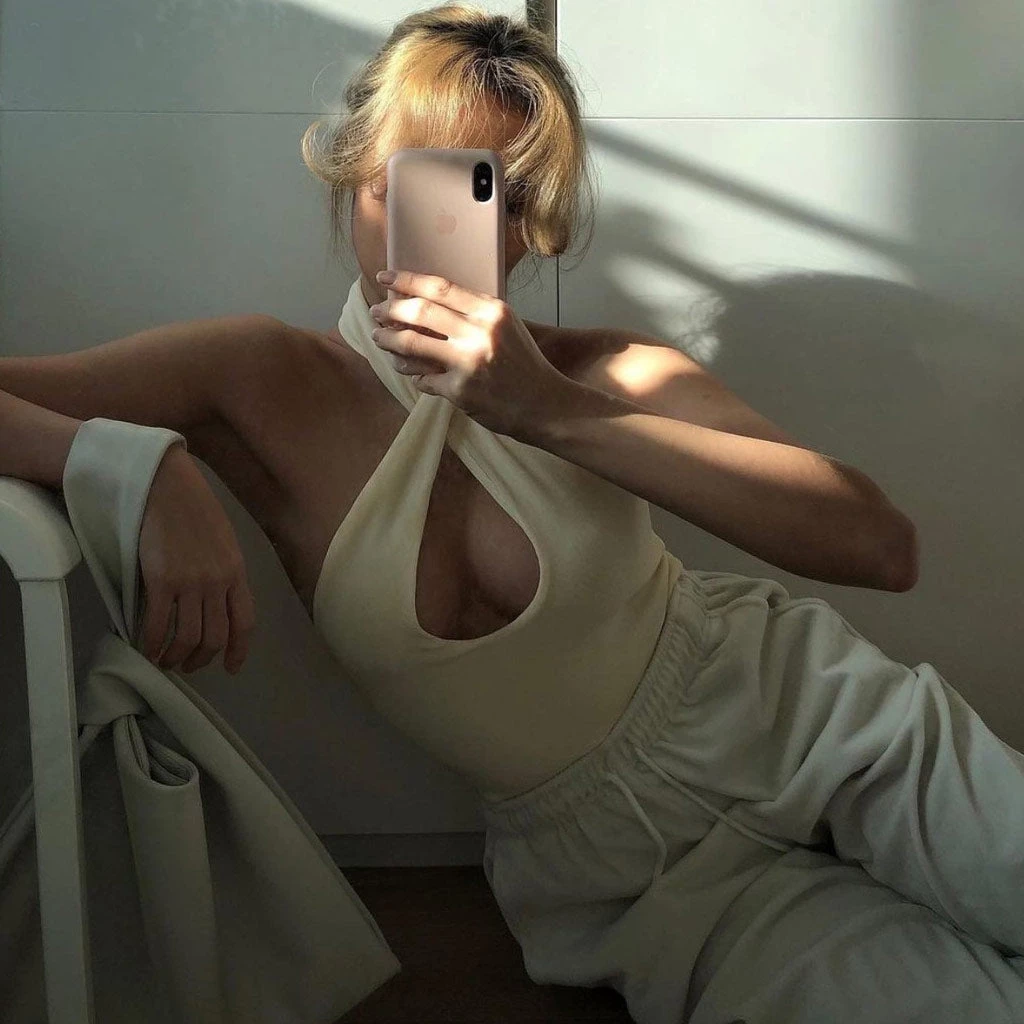 This halter top is one of the coolest, street pieces to pair with denim. Made of stretchy polyester fabric in solid color, embellished with a cropped length, featuring a slim fit cut along with a crossed halter strap, a cut-out to the front and a pullover styling. Find more unique women’s crop tops or trendy clothing in our boutique, and go ahead and treat yourself with vintage denim for an off-duty look.