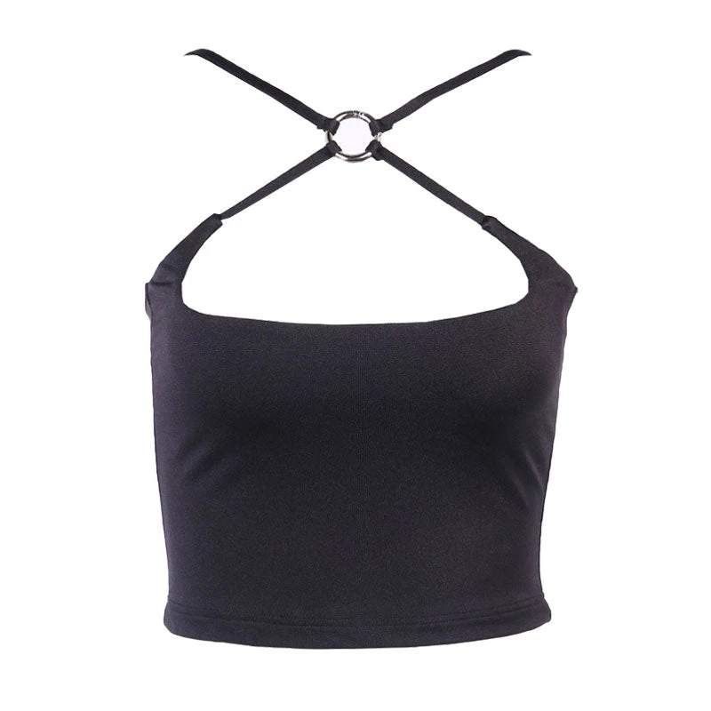 This chic crop is hot yet stunning. Crafted with lightweight polyester fabric in solid color, stand out in crisscross straps with a metal hoop at the chest, featuring a slim fit cut structured with a pullover styling and a cropped length accented with a midriff cut at the waist. Find more unique women’s crop tops or trendy clothing in our boutique, and pair it well into all sorts of off-duty looks.