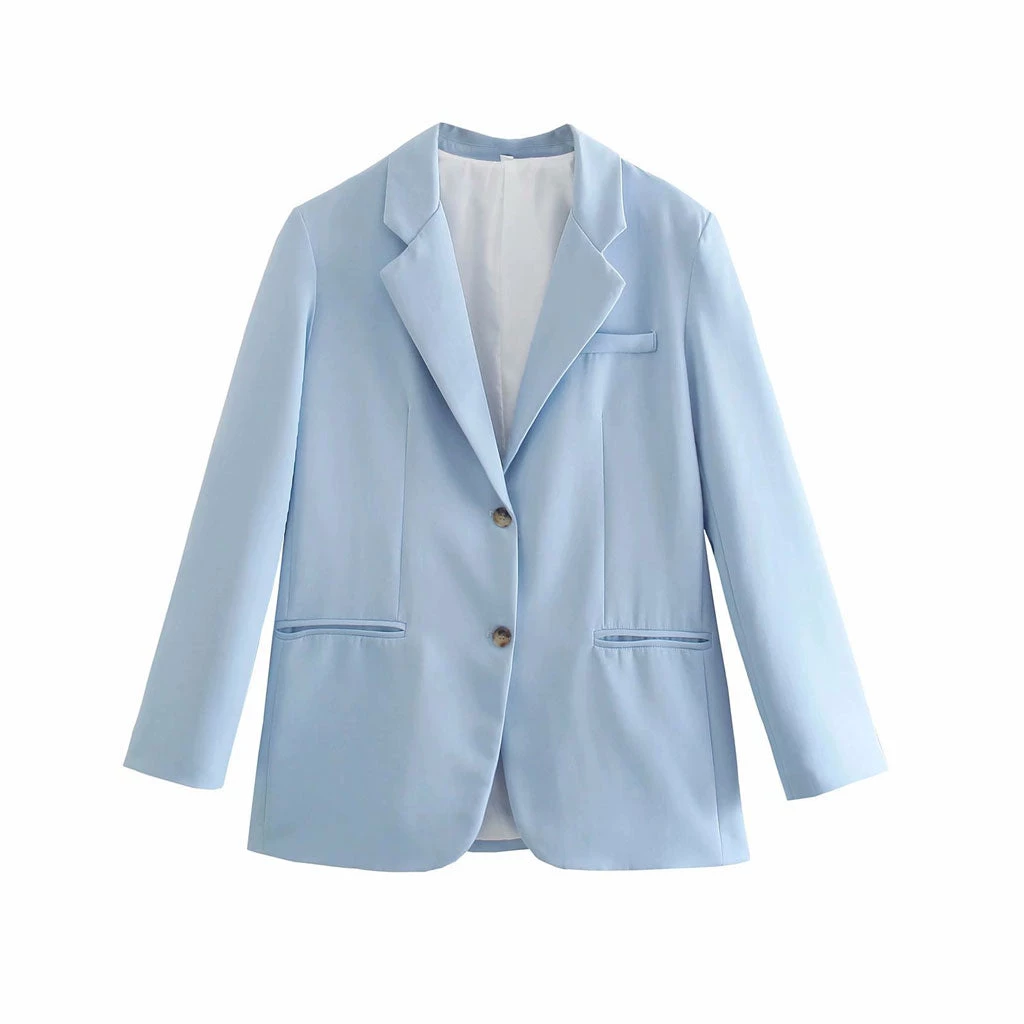 This modern style blazer brings a little extra pizzazz to your fall wardrobe. Made of blend cotton and polyester, stand out in a refreshing baby blue hue, featuring an oversized cut tailored with notch lapels and a two-button placket to the front, a long sleeve styling, a faux welt pocket at the chest along with seamed patch pockets at sides, and ended up with an elongated hem. Find more unique women’s blazers or trendy clothing in our boutique, and tuck in your tee and add a pair of Heels for a chic look.