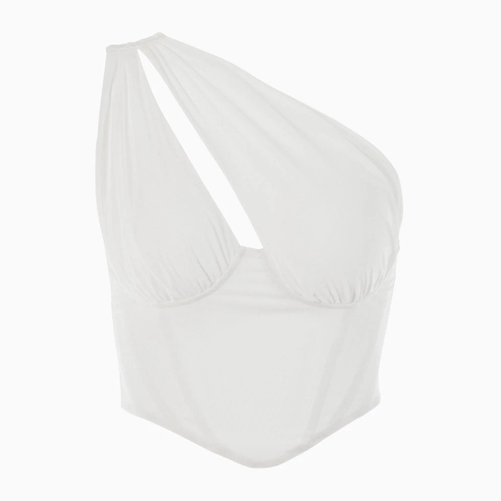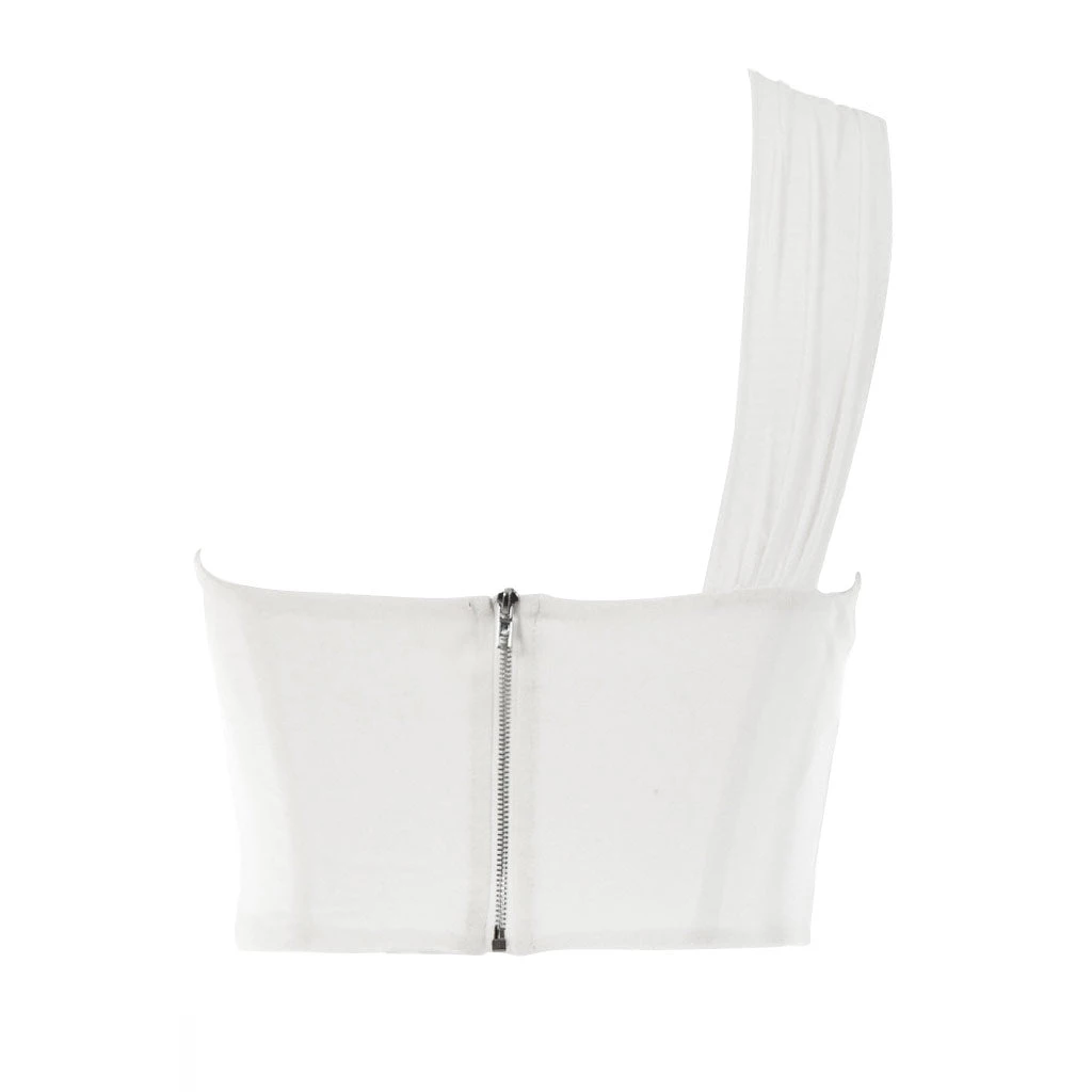 Everything about this crop top is perfect. Made of blend cotton and polyester fabric, embellished with a single-shoulder styling along with a cut-out, featuring a slim fit cut structured with a bustier-like neckline, topstitching seams, a zip fastening to the rear, and a cropped length accented with a curved hem. Find more unique women’s crop tops or trendy clothing in our boutique, and tuck in your denim and add a pair of chic heels.